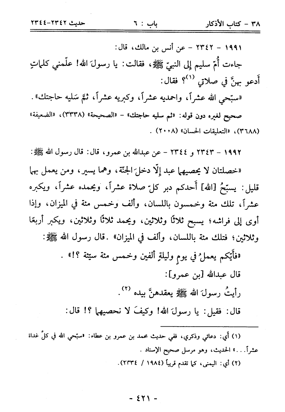 "خصلتان لا يحصيهما عبد إِلّا دخلَ الجنّة، وهما يسير، ومن يعمل بهما قليل: يسبّحُ [الله] أَحدكم دبر كلّ صلاة عشرًا، ويحمده عشرًا، ويكبره عشرًا، تلك مئة وخمسون باللسان، وألف وخمس مئة في الميزان, وإذا أوى إلى فراشه؛ يسبح ثلاثًا وثلاثين، ويحمد ثلاثًا وثلاثين، ويكبر أربعًا وثلاثين؛ فتلك مئة باللسان، وألف في الميزان". قال رسول الله - صلى الله عليه وسلم -: