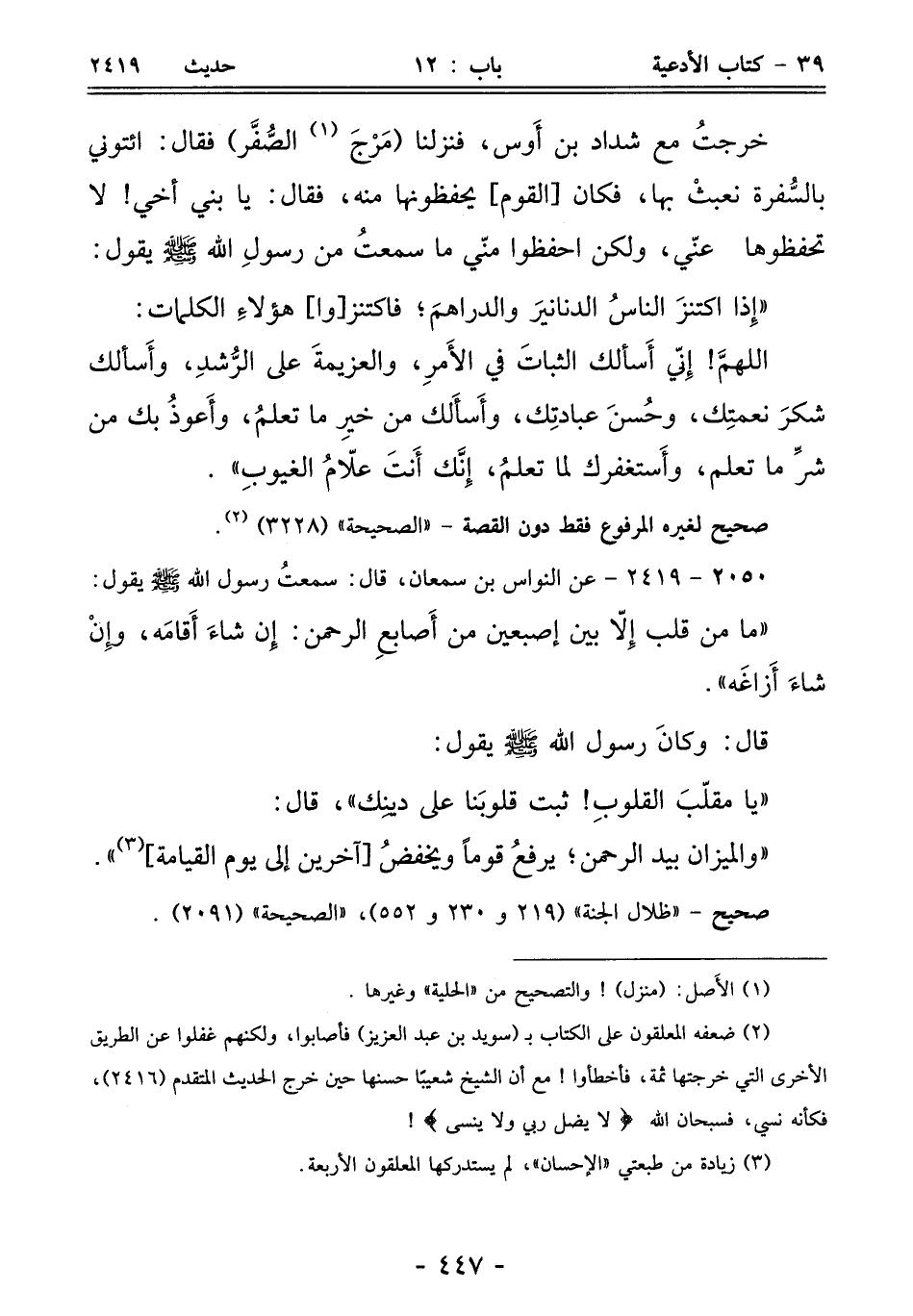 "ما من قلب إِلّا بين إصبعين من أَصابعِ الرحمن: إِن شاءَ أَقامَه، وإِنْ شاءَ أَزاغَه".