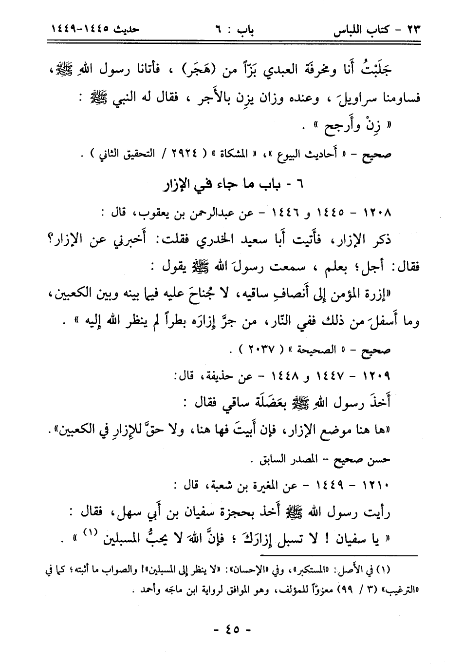 "إزرة المؤمن إِلى أَنصافِ ساقيه، لا جُناحَ عليه فيما بينه وبين الكعبين، وما أَسفلَ من ذلك ففي النّار، من جرَّ إزارَه بطرًا لم ينظر الله إِليه".