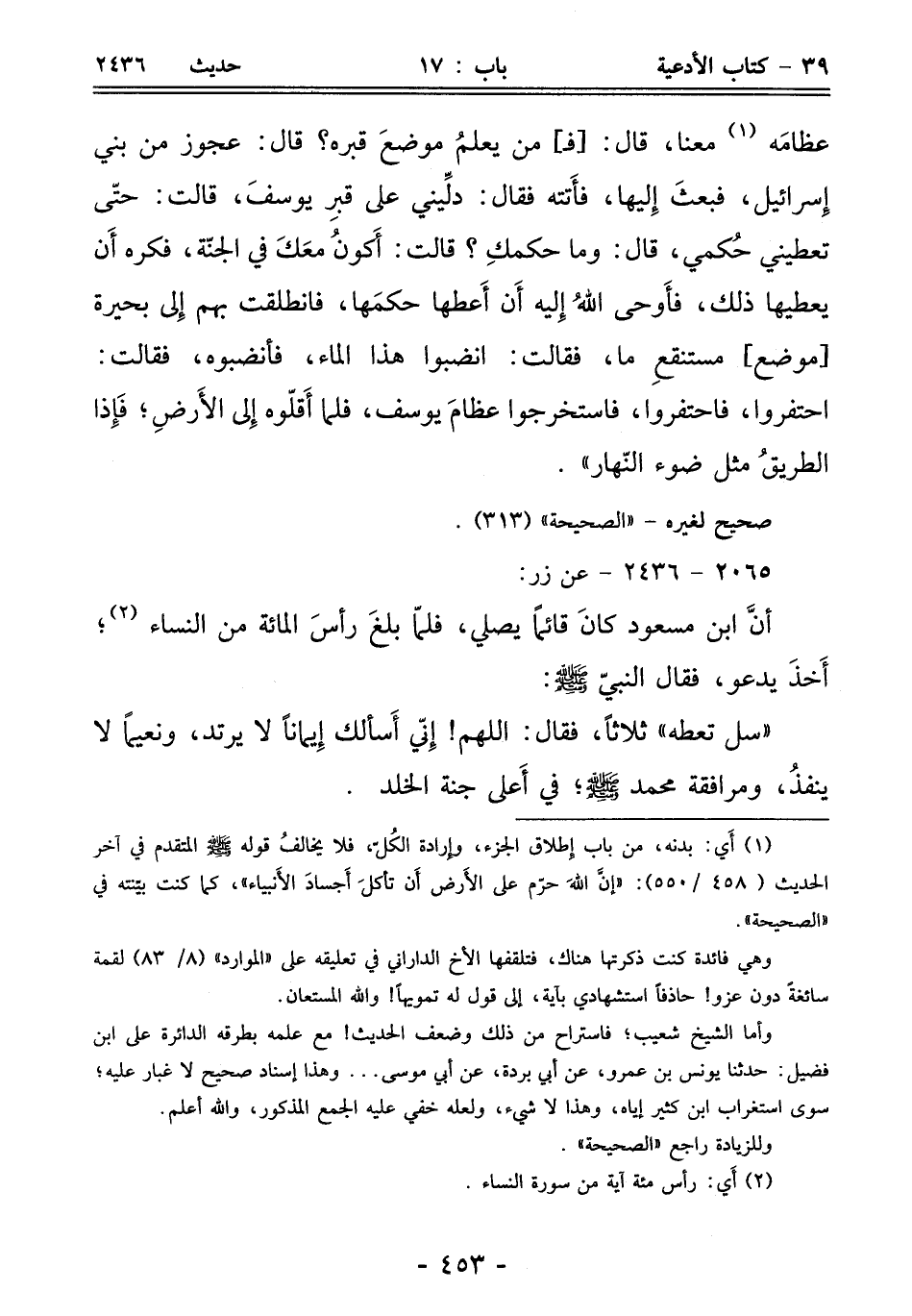"سل تعطه" ثلاثًا، فقال: اللهم! إِنّي أَسألك إِيمانًا لا يرتد، ونعيمًا لا ينفذُ، ومرافقة محمَّد - صلى الله عليه وسلم -؛ في أَعلى جنة الخلد.