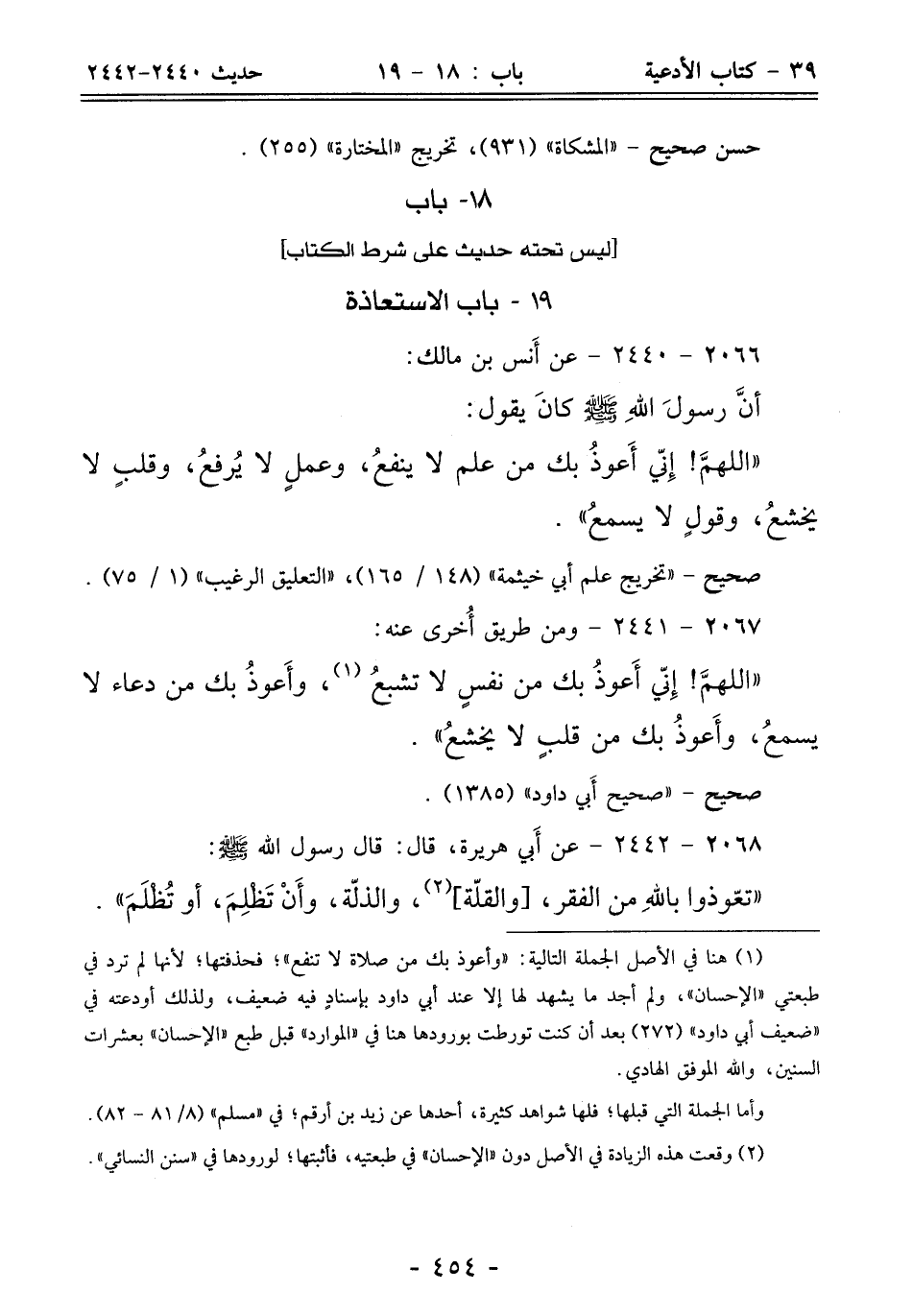 (¬1) هنا في الأصل الجملة التالية: "وأعوذ بك من صلاة لا تنفع"؛ فحذفتها؛ لأنها لم ترد في طبعتي "الإحسان"، ولم أجد ما يشهد لها إلا عند أبي داود بإسنادٍ فيه ضعيف، ولذلك أودعته في "ضعيف أبي داود" (272) بعد أن كنت تورطت بورودها هنا في "الموارد" قبل طبع "الإحسان" بعشرات السنين، والله الموفق الهادي.