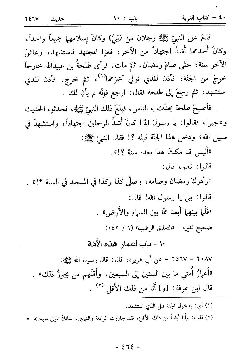 قدمَ على النبيّ - صلى الله عليه وسلم - رجلان من (بَليَّ) وكانَ إِسلامهما جميعًا واحدًا، وكانَ أَحدهما أَشدّ اجتهادًا من الآخر، فغزا المجتهد فاستشهد، وعاشَ الآخر سنة؛ حتّى صامَ رمضان، ثمَّ مات، فرأى طلحةُ بن عبيد الله خارجًا خرجَ من الجنّة؛ فأذن للذي توفي آخرَهما (¬1)، ثمَّ خرج، فأذن للذي استشهد، ثمَّ رجعَ إِلى طلحة فقال: ارجع فإِنّه لم يأنِ لك.