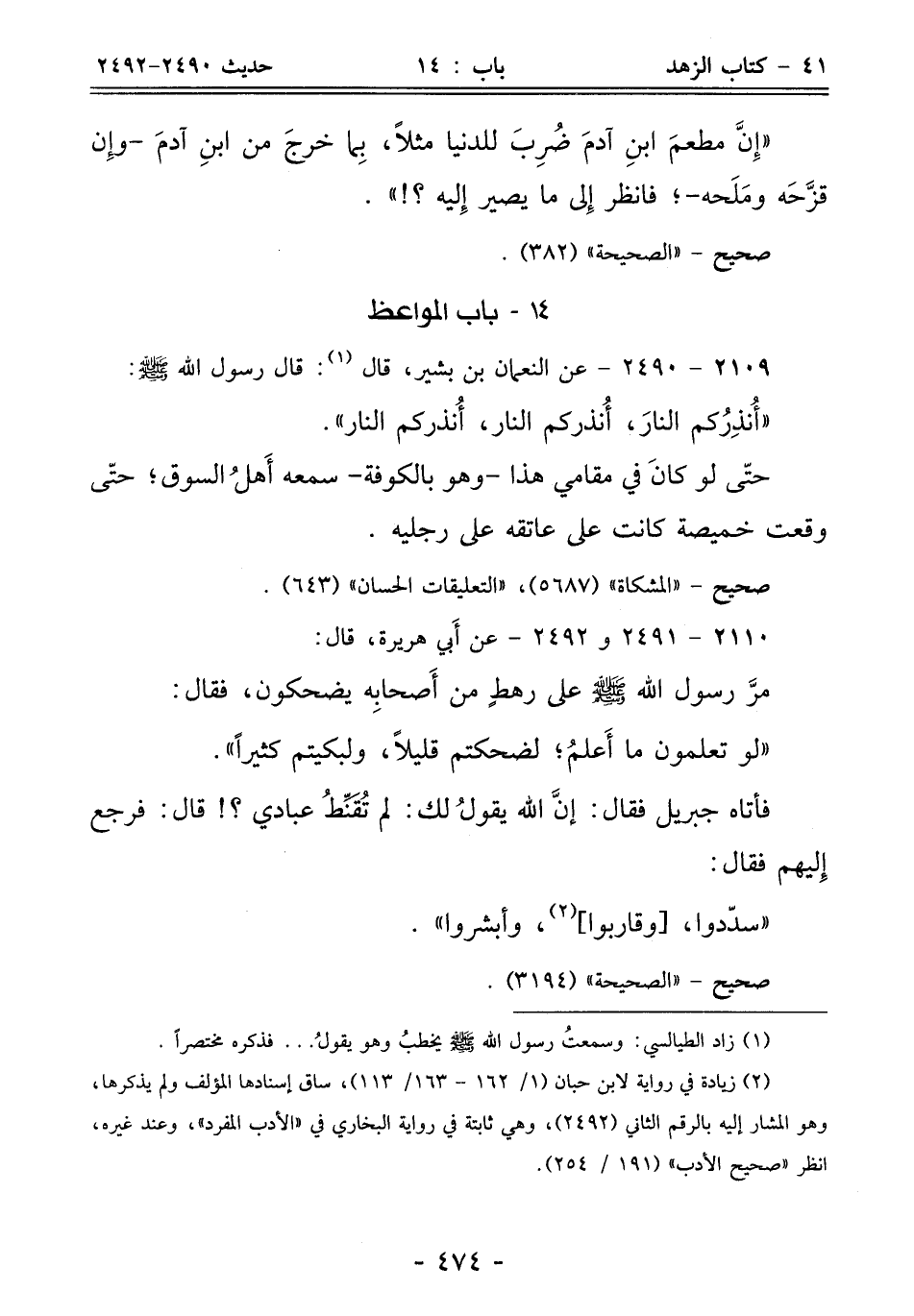 (¬2) زيادة في رواية لابن حبان (1/ 162 - 163/ 113)، ساق إسنادها المؤلف ولم يذكرها، وهو المشار إليه بالرقم الثاني (2492)، وهي ثابتة في رواية البخاري في "الأدب المفرد"، وعند غيره، انظر "صحيح الأدب" (191/ 254).