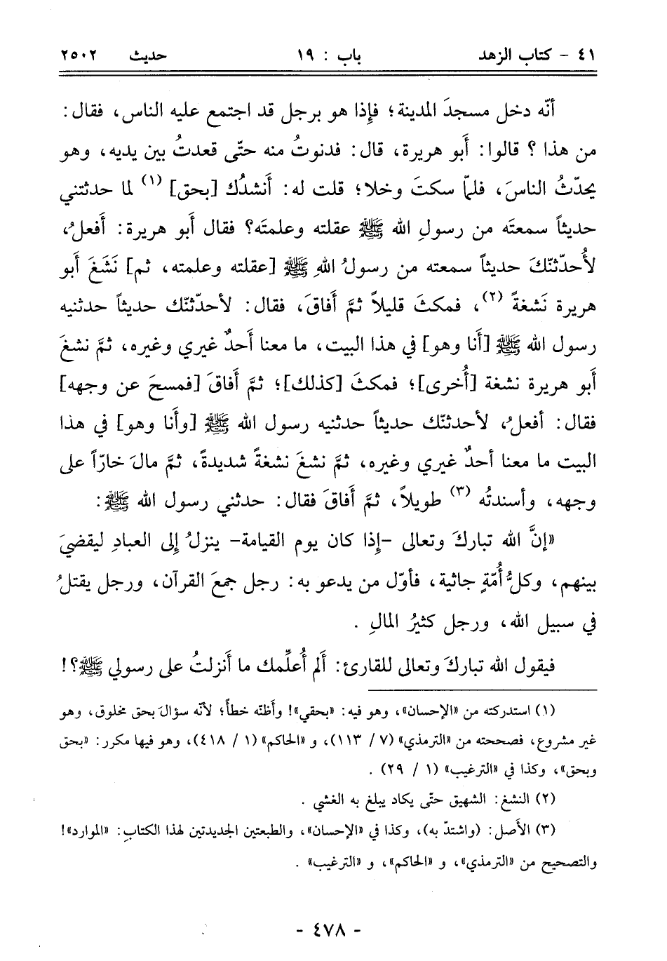 "إنَّ الله تباركَ وتعالى - إِذا كان يوم القيامة - ينزلُ إِلى العبادِ ليقضيَ بينهم، وكلُّ أُمّةٍ جاثية، فأوّل من يدعو به: رجل جمعَ القرآن، ورجل يقتلُ في سبيل الله، ورجل كثيرُ المالِ.