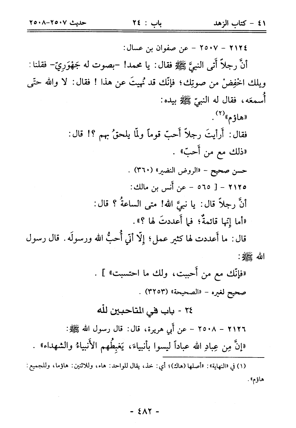 قال: ما أَعددت لها كثير عمل؛ إِلّا أنّي أُحبُّ الله ورسولَه. قال رسول الله - صلى الله عليه وسلم -:
