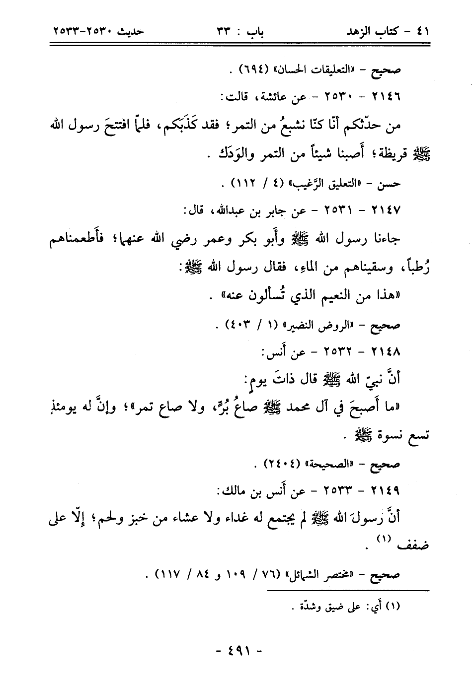 أنَّ رسولَ الله - صلى الله عليه وسلم - لم يجتمع له غداء ولا عشاء من خبز ولحم؛ إِلّا على ضفف (¬1).