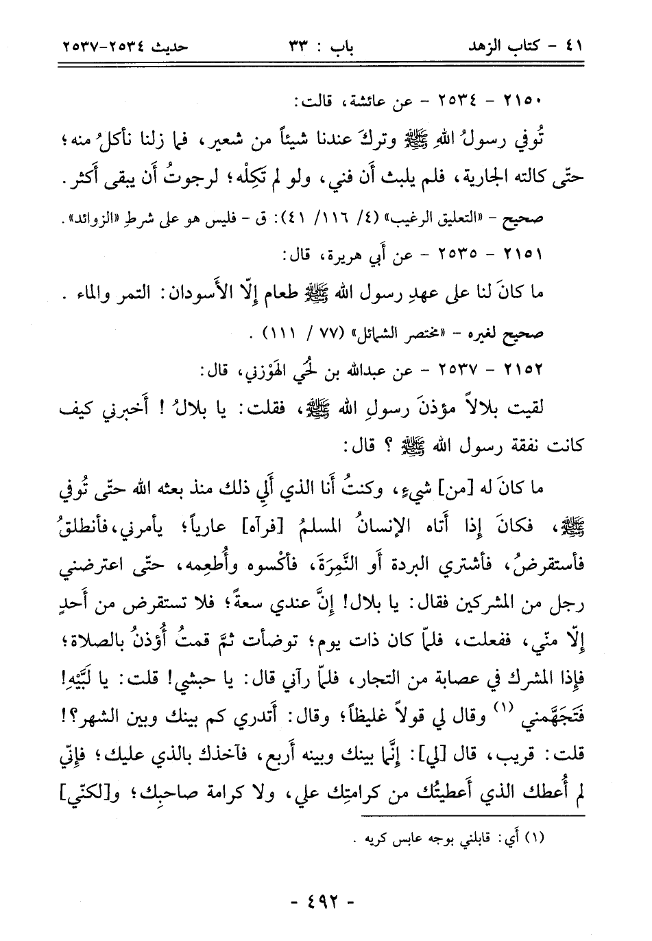 لقيت بلالاً مؤذنَ رسولِ الله - صلى الله عليه وسلم -، فقلت: يا بلالُ! أَخبرني كيف كانت نفقة رسول الله - صلى الله عليه وسلم -؟ قال: