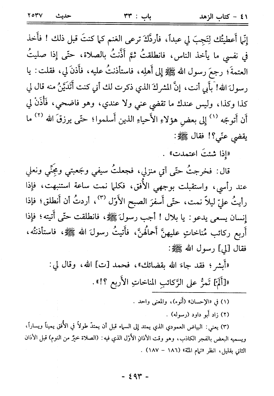 (¬3) يعني: البياض العمودي الذي يمتد إلى السماء قبل أن يمتدّ طولاً في الأُفق يمينًا ويسارًا، ويسميه البعض بالفجر الكاذب، وهو وقت الأذانِ الأَوّل الذي فيه: (الصلاة خيرٌ من النوم) قبل الأذان الثاني بقليل، انظر "تمام المنّة" (186 - 187).