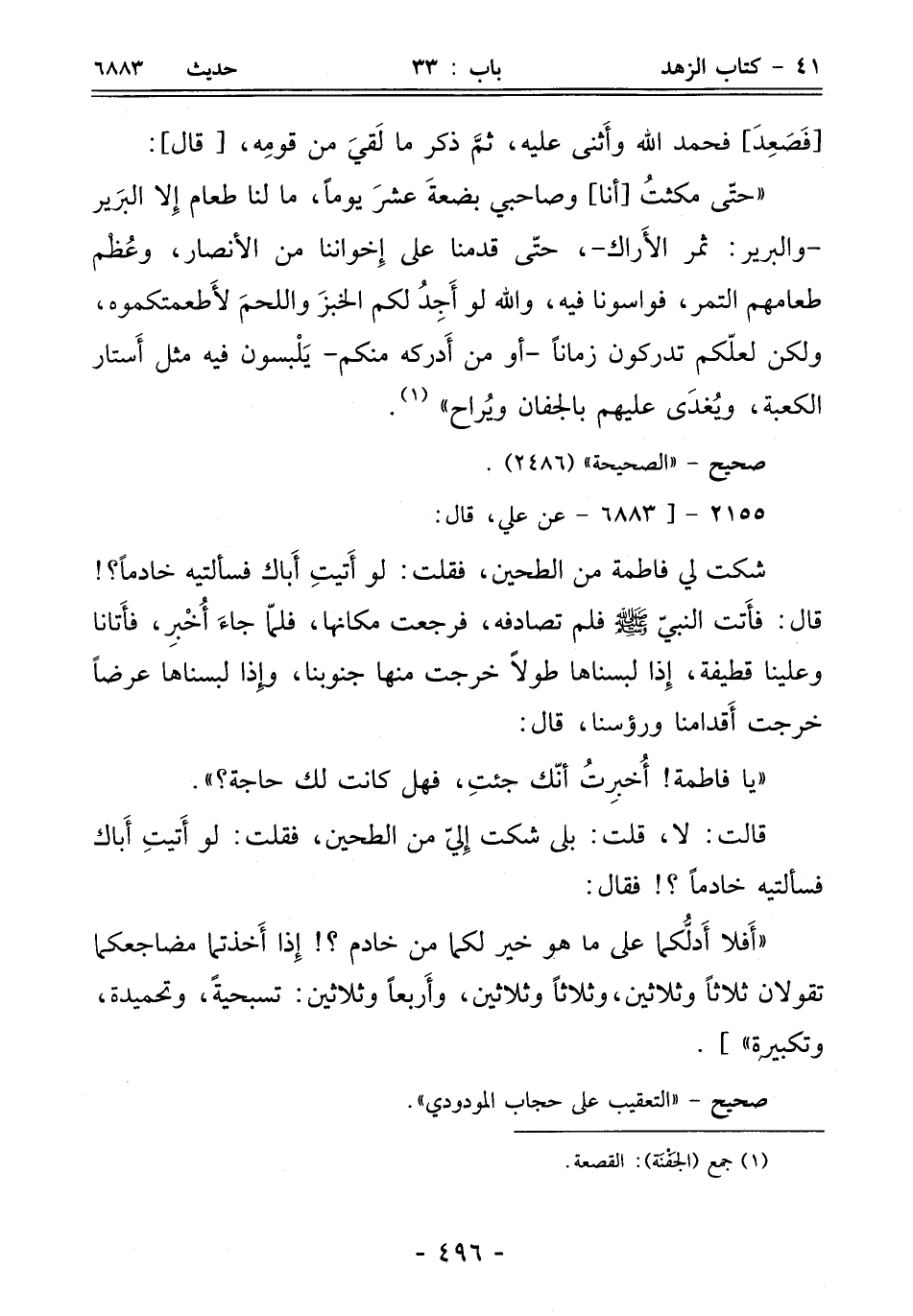 "أَفلا أَدلُّكما على ما هو خير لكما من خادم؟! إِذا أَخذتما مضاجعكما تقولان ثلاثًا وثلاثين، وثلاثًا وثلاثين، وأَربعًا وثلاثين: تسبيحةً، وتحميدة، وتكبيرة"].