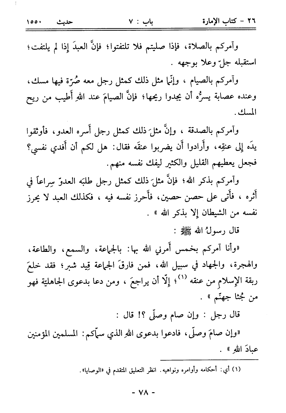 "وأنا آمركم بخمس أَمرني الله بها: بالجماعة، والسمع، والطاعة، والهجرة، والجهاد في سبيل الله، فمن فارقَ الجماعة قِيد شبر؛ فقد خلعَ ربقة الإِسلامِ من عنقه (¬1)؛ إِلّا أن يراجعَ، ومن دعا بدعوى الجاهليّة فهو من جُثا جهنّم".