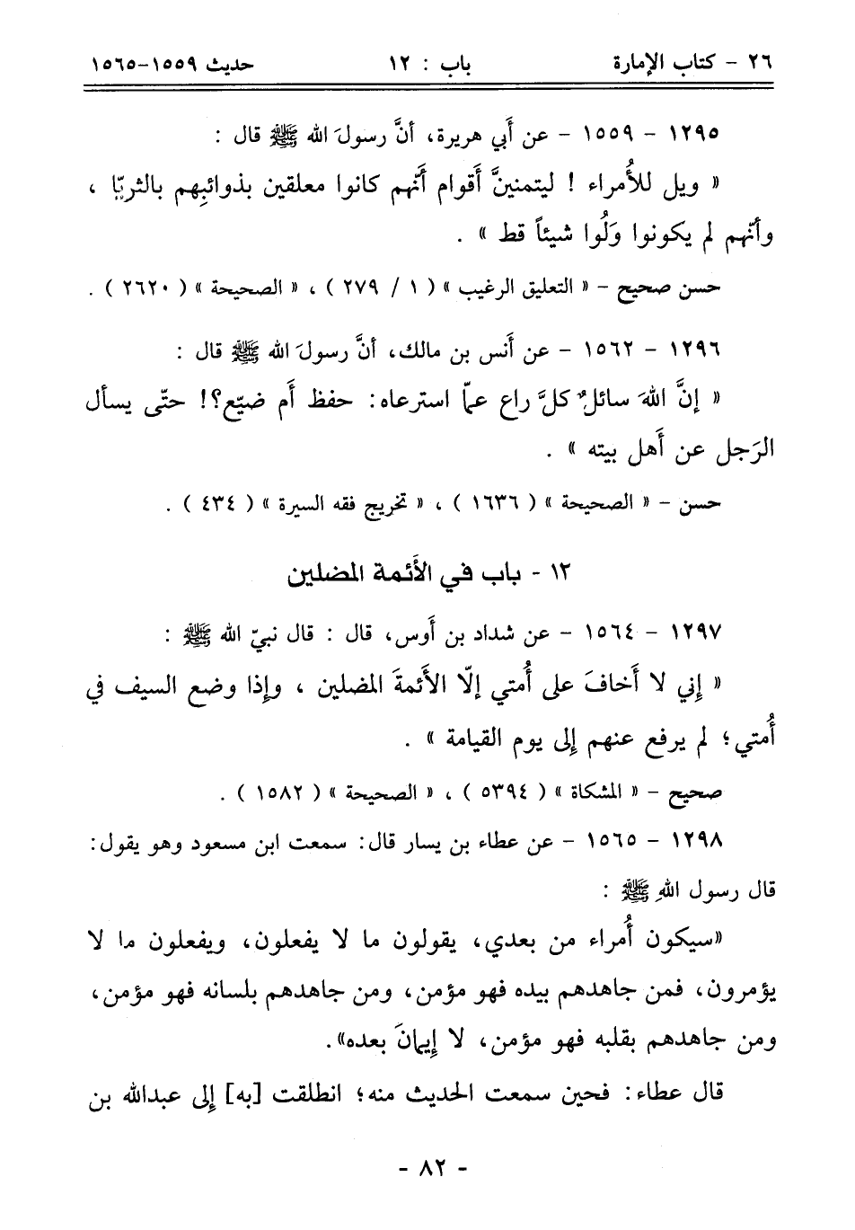 "سيكون أُمراء من بعدي، يقولون ما لا يفعلون، ويفعلون ما لا يؤمرون، فمن جاهدهم بيده فهو مؤمن، ومن جاهدهم بلسانه فهو مؤمن، ومن جاهدهم بقلبه فهو مؤمن، لا إِيمانَ بعده".
