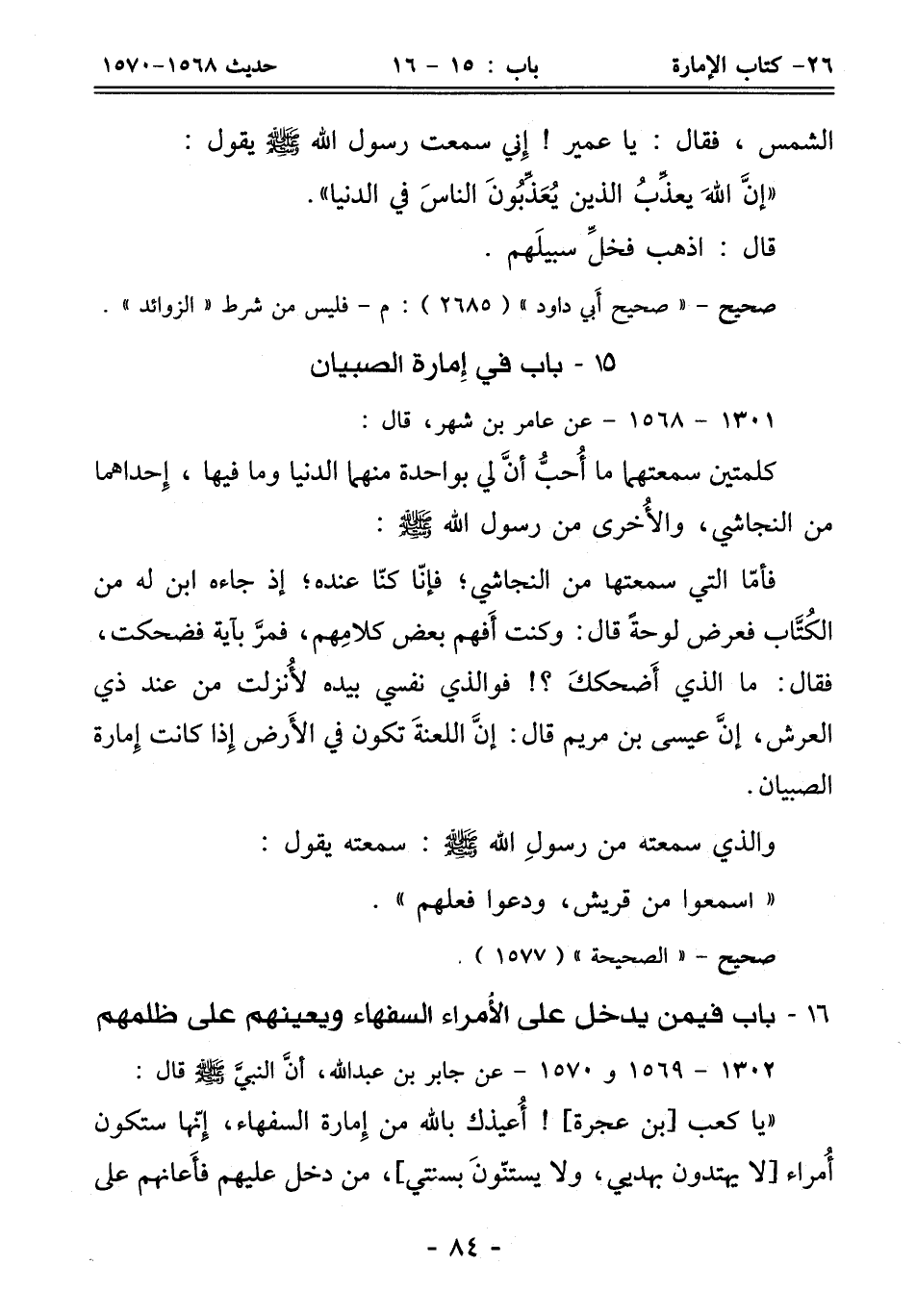 "يا كعب [بن عجرة]! أُعيذك بالله من إِمارة السفهاء، إنّها ستكون أُمراء [لا يهتدون بهديي، ولا يستنّونَ بسنتي]، من دخل عليهم فأَعانهم على