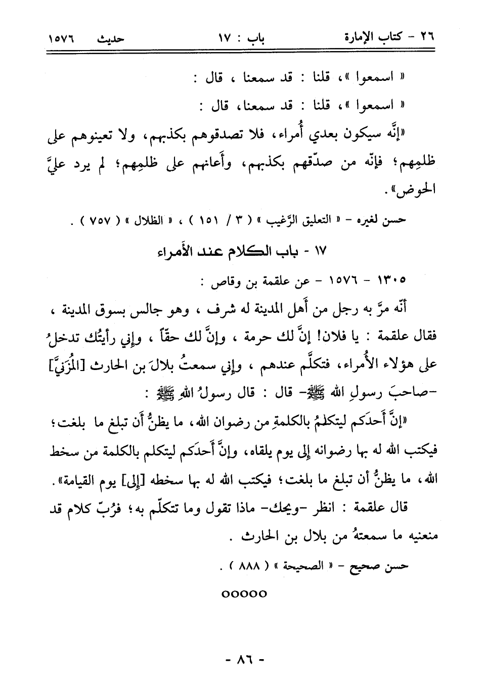 "إنَّه سيكون بعدي أُمراء، فلا تصدقوهم بكذبهم، ولا تعينوهم على ظلمِهم؛ فإنّه من صدّقهم بكذبهم، وأَعانهم على ظلمِهم؛ لم يرد عليَّ الحوض".