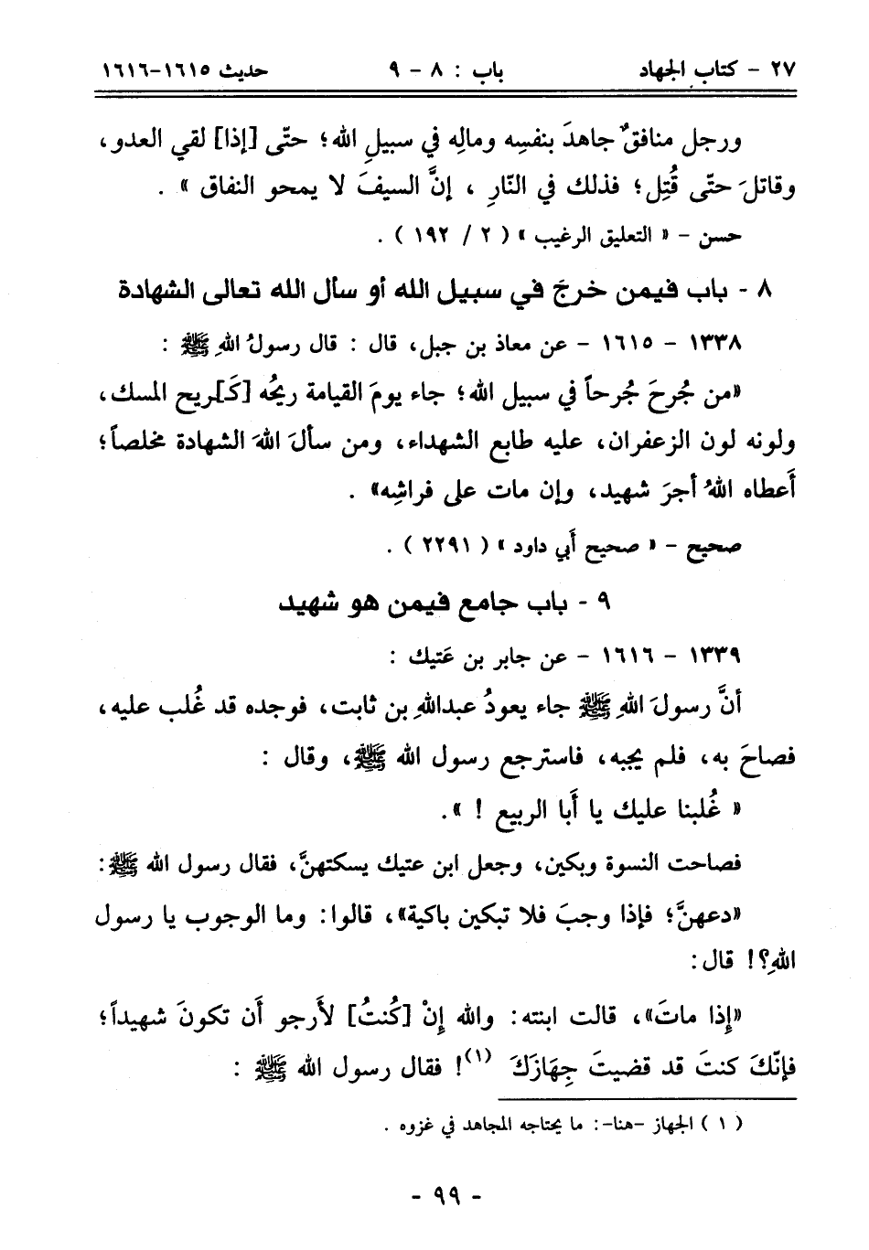 "من جُرحَ جُرحًا في سبيل الله؛ جاء يومَ القيامة ريحُه [كَـ]ـريح المسك، ولونه لون الزعفران، عليه طابع الشهداء، ومن سألَ الله الشهادة مخلصًا؛ أَعطاه اللهُ أجرَ شهيد، وإن مات على فراشِه".