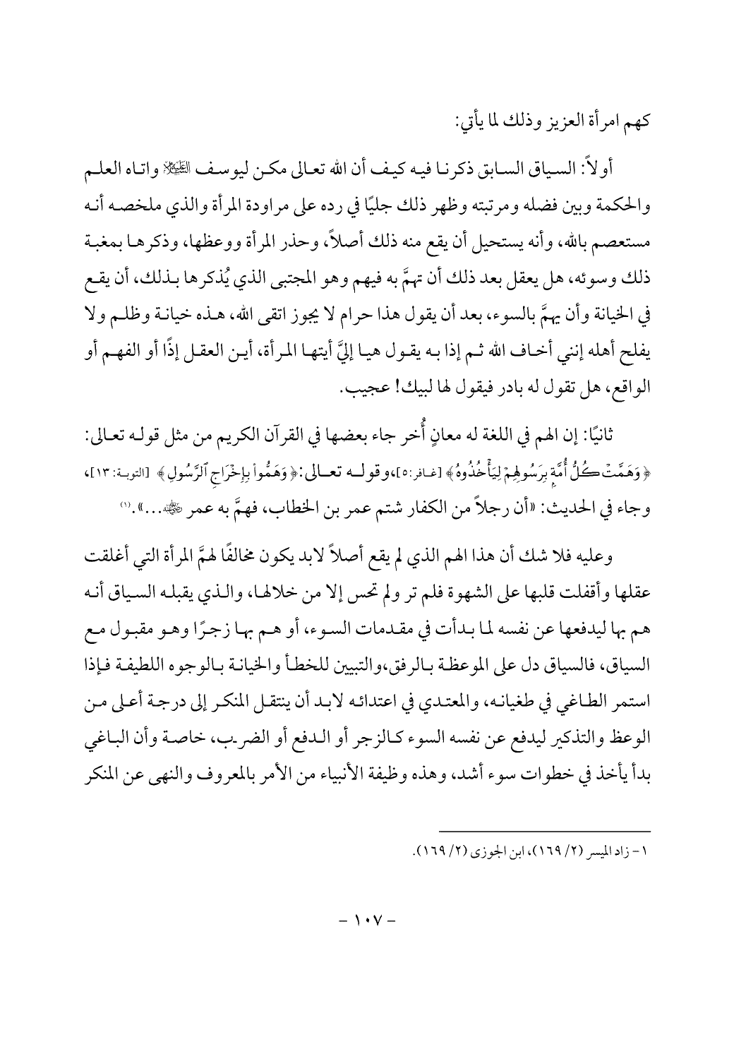 وعليه فلا شك أن هذا الهم الذي لم يقع أصلاً لابد يكون مخالفًا لهمَّ المرأة التي أغلقت عقلها وأقفلت قلبها على الشهوة فلم تر ولم تحس إلا من خلالها، والذي يقبله السياق أنه هم بها ليدفعها عن نفسه لما بدأت في مقدمات السوء، أو هم بها زجرًا وهو مقبول مع السياق، فالسياق دل على الموعظة بالرفق، والتبيين للخطأ والخيانة بالوجوه اللطيفة فإذا استمر الطاغي في طغيانه، والمعتدي في اعتدائه لابد أن ينتقل المنكر إلى درجة أعلى من الوعظ والتذكير ليدفع عن نفسه السوء كالزجر أو الدفع أو الضرب، خاصة وأن الباغي بدأ يأخذ في خطوات سوء أشد، وهذه وظيفة الأنبياء من الأمر بالمعروف والنهى عن المنكر