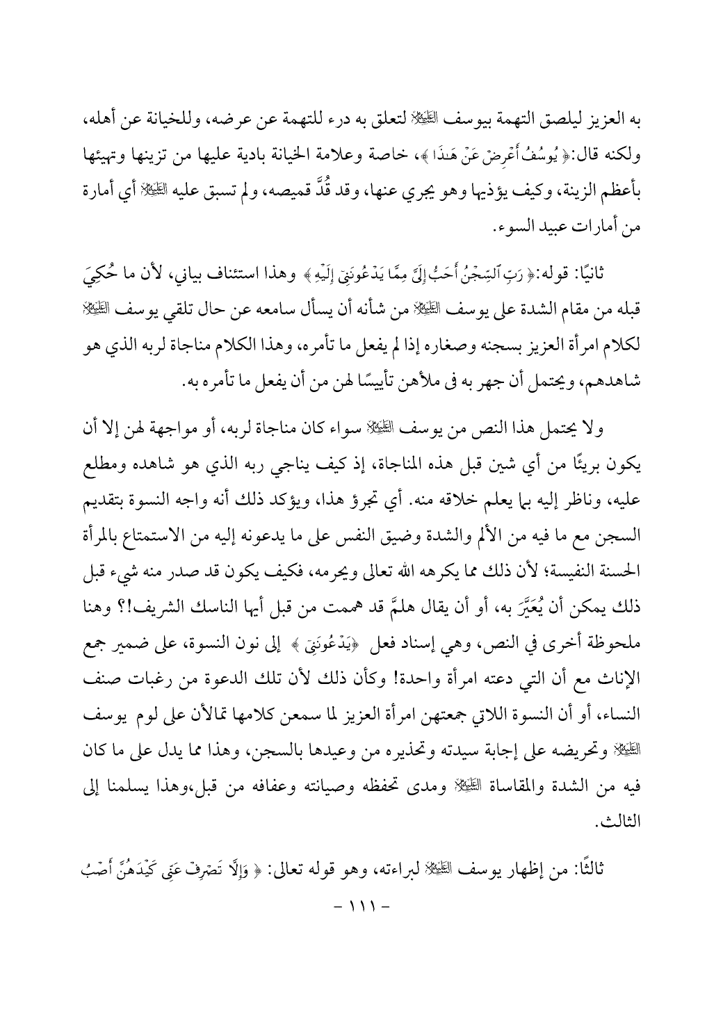 ولا يحتمل هذا النص من يوسف - عليه السلام - سواء كان مناجاة لربه، أو مواجهة لهن إلا أن يكون بريئًا من أي شين قبل هذه المناجاة، إذ كيف يناجي ربه الذي هو شاهده ومطلع عليه، وناظر إليه بما يعلم خلاقه منه. أي تجرؤ هذا، ويؤكد ذلك أنه واجه النسوة بتقديم السجن مع ما فيه من الألم والشدة وضيق النفس على ما يدعونه إليه من الاستمتاع بالمرأة الحسنة النفيسة؛ لأن ذلك مما يكرهه الله تعالى ويحرمه، فكيف يكون قد صدر منه شيء قبل ذلك يمكن أن يُعَيَّرَ به، أو أن يقال هلمَّ قد هممت من قبل أيها الناسك الشريف!؟ وهنا ملحوظة أخرى في النص، وهي إسناد فعل {يَدْعُونَنِي} إلى نون النسوة، على ضمير جمع الإناث مع أن التي دعته امرأة واحدة! وكأن ذلك لأن تلك الدعوة من رغبات صنف النساء، أو أن النسوة اللاتي جمعتهن امرأة العزيز لما سمعن كلامها تمالأن على لوم يوسف - عليه السلام - وتحريضه على إجابة سيدته وتحذيره من وعيدها بالسجن، وهذا مما يدل على ما كان فيه من الشدة والمقاساة - عليه السلام - ومدى تحفظه وصيانته وعفافه من قبل، وهذا يسلمنا إلى الثالث.
