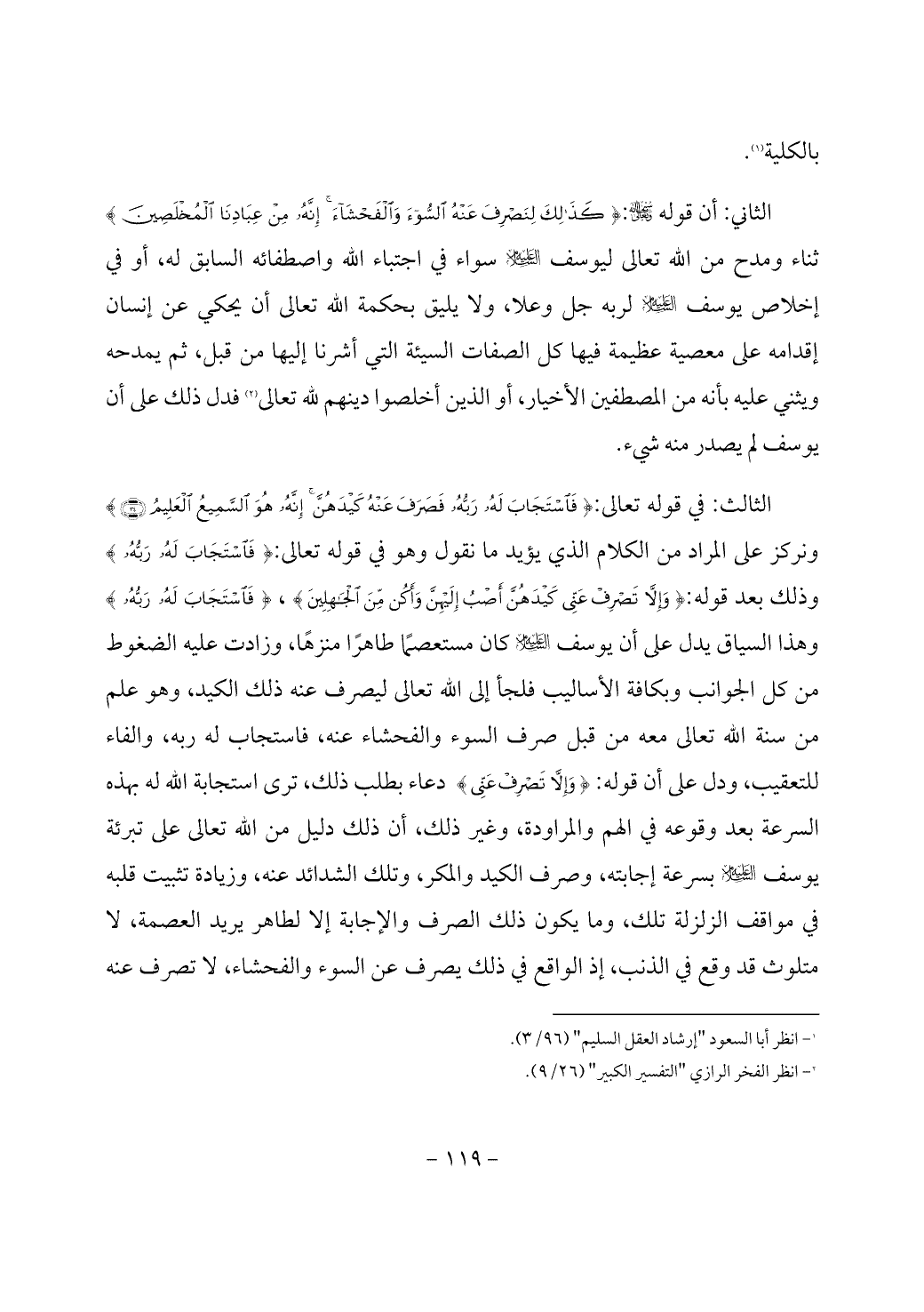 الثاني: أن قوله - سبحانه وتعالى -: {كَذَلِكَ لِنَصْرِفَ عَنْهُ السُّوءَ وَالْفَحْشَاءَ إِنَّهُ مِنْ عِبَادِنَا الْمُخْلَصِينَ} ثناء ومدح من الله تعالى ليوسف - عليه السلام - سواء في اجتباء الله واصطفائه السابق له، أو في إخلاص يوسف - عليه السلام - لربه جل وعلا، ولا يليق بحكمة الله تعالى أن يحكي عن إنسان إقدامه على معصية عظيمة فيها كل الصفات السيئة التي أشرنا إليها من قبل، ثم يمدحه ويثني عليه بأنه من المصطفين الأخيار، أو الذين أخلصوا دينهم لله تعالى (¬2) فدل ذلك على أن يوسف لم يصدر منه شيء.