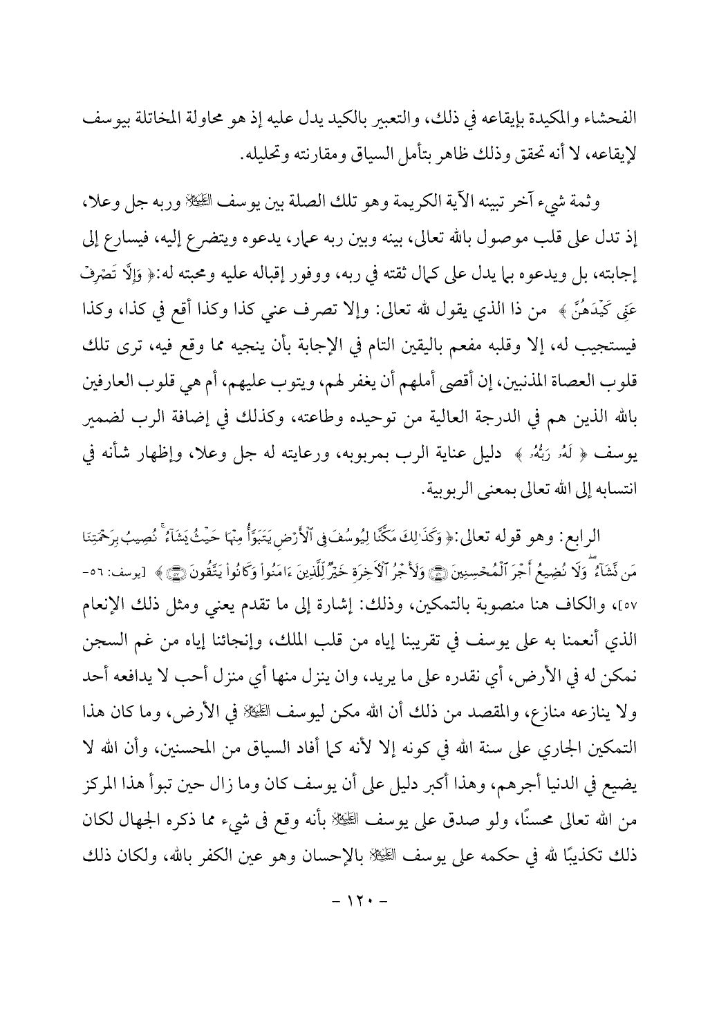 الرابع: وهو قوله تعالى: {وَكَذَلِكَ مَكَّنَّا لِيُوسُفَ فِي الْأَرْضِ يَتَبَوَّأُ مِنْهَا حَيْثُ يَشَاءُ نُصِيبُ بِرَحْمَتِنَا مَنْ نَشَاءُ وَلَا نُضِيعُ أَجْرَ الْمُحْسِنِينَ (56) وَلَأَجْرُ الْآَخِرَةِ خَيْرٌ لِلَّذِينَ آَمَنُوا وَكَانُوا يَتَّقُونَ (57)} [يوسف: 56 - 57]، والكاف هنا منصوبة بالتمكين، وذلك: إشارة إلى ما تقدم يعني ومثل ذلك الإنعام الذي أنعمنا به على يوسف في تقريبنا إياه من قلب الملك، وإنجائنا إياه من غم السجن نمكن له في الأرض، أي نقدره على ما يريد، وان ينزل منها أي منزل أحب لا يدافعه أحد ولا ينازعه منازع، والمقصد من ذلك أن الله مكن ليوسف - عليه السلام - في الأرض، وما كان هذا التمكين الجاري على سنة الله في كونه إلا لأنه كما أفاد السياق من المحسنين، وأن الله لا يضيع في الدنيا أجرهم، وهذا أكبر دليل على أن يوسف كان وما زال حين تبوأ هذا المركز من الله تعالى محسنًا، ولو صدق على يوسف - عليه السلام - بأنه وقع في شيء مما ذكره الجهال لكان ذلك تكذيبًا لله في حكمه على يوسف - عليه السلام - بالإحسان وهو عين الكفر بالله، ولكان ذلك