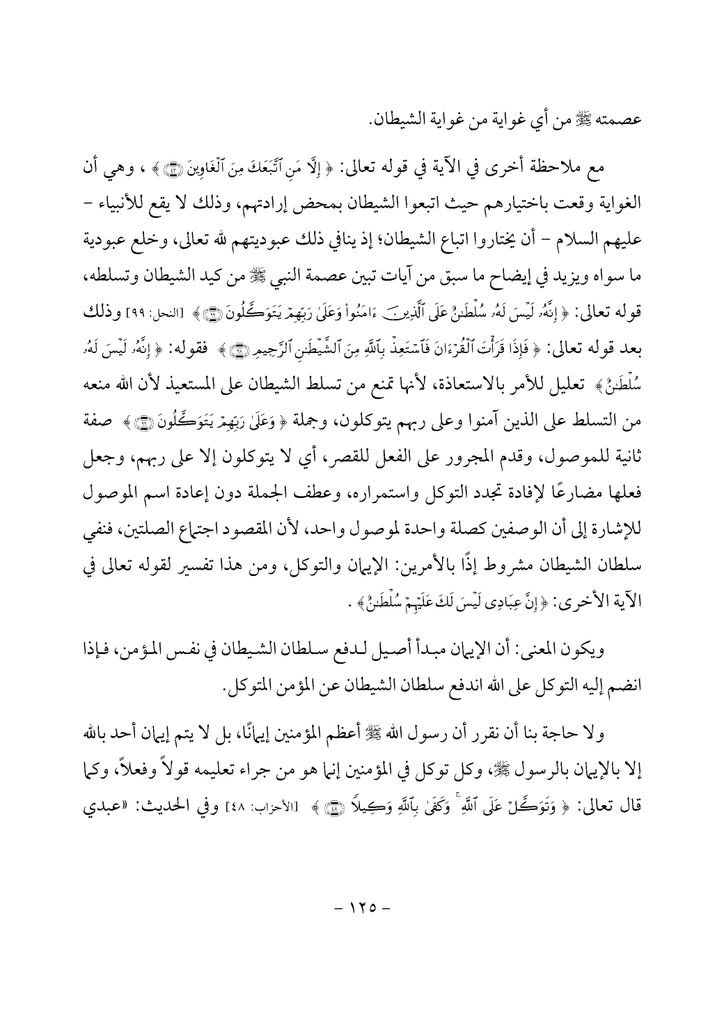 مع ملاحظة أخرى في الآية في قوله تعالى: {إِلَّا مَنِ اتَّبَعَكَ مِنَ الْغَاوِينَ (42)}، وهي أن الغواية وقعت باختيارهم حيث اتبعوا الشيطان بمحض إرادتهم، وذلك لا يقع للأنبياء - عليهم السلام - أن يختاروا اتباع الشيطان؛ إذ ينافي ذلك عبوديتهم لله تعالى، وخلع عبودية ما سواه ويزيد في إيضاح ما سبق من آيات تبين عصمة النبي - صَلَّى اللَّهُ عَلَيْهِ وَسَلَّمَ - من كيد الشيطان وتسلطه، قوله تعالى: {إِنَّهُ لَيْسَ لَهُ سُلْطَانٌ عَلَى الَّذِينَ آَمَنُوا وَعَلَى رَبِّهِمْ يَتَوَكَّلُونَ (99)} [النحل: 99] وذلك بعد قوله تعالى: {فَإِذَا قَرَأْتَ الْقُرْآَنَ فَاسْتَعِذْ بِاللَّهِ مِنَ الشَّيْطَانِ الرَّجِيمِ (98)} فقوله: {إِنَّهُ لَيْسَ لَهُ سُلْطَانٌ} تعليل للأمر بالاستعاذة، لأنها تمنع من تسلط الشيطان على المستعيذ لأن الله منعه من التسلط على الذين آمنوا وعلى ربهم يتوكلون، وجملة {وَعَلَى رَبِّهِمْ يَتَوَكَّلُونَ (99)} صفة ثانية للموصول، وقدم المجرور على الفعل للقصر، أي لا يتوكلون إلا على ربهم، وجعل فعلها مضارعًا لإفادة تجدد التوكل واستمراره، وعطف الجملة دون إعادة اسم الموصول للإشارة إلى أن الوصفين كصلة واحدة لموصول واحد، لأن المقصود اجتماع الصلتين، فنفي سلطان الشيطان مشروط إذًا بالأمرين: الإيمان والتوكل، ومن هذا تفسير لقوله تعالى في الآية الأخرى: {إِنَّ عِبَادِي لَيْسَ لَكَ عَلَيْهِمْ سُلْطَانٌ}.