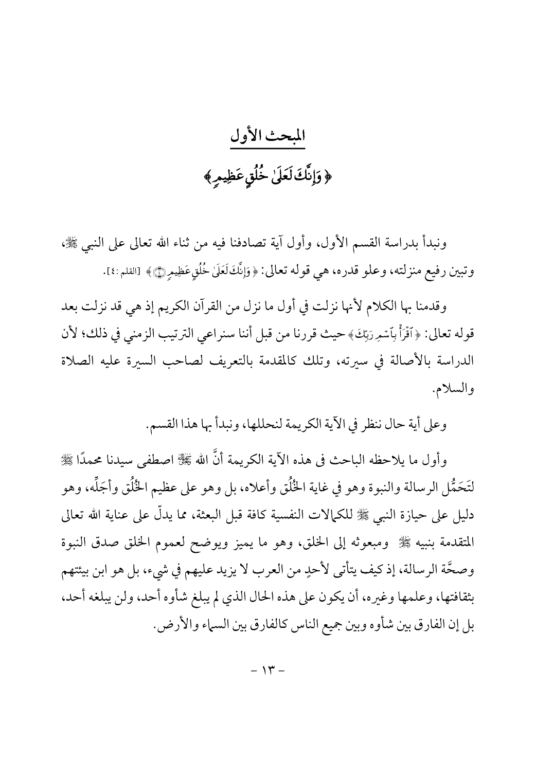 ونبدأ بدراسة القسم الأول، وأول آية تصادفنا فيه من ثناء الله تعالى على النبي - صَلَّى اللَّهُ عَلَيْهِ وَسَلَّمَ -، وتبين رفيع منزلته، وعلو قدره، هي قوله تعالى: {وَإِنَّكَ لَعَلَى خُلُقٍ عَظِيمٍ (4)} [القلم: 4].