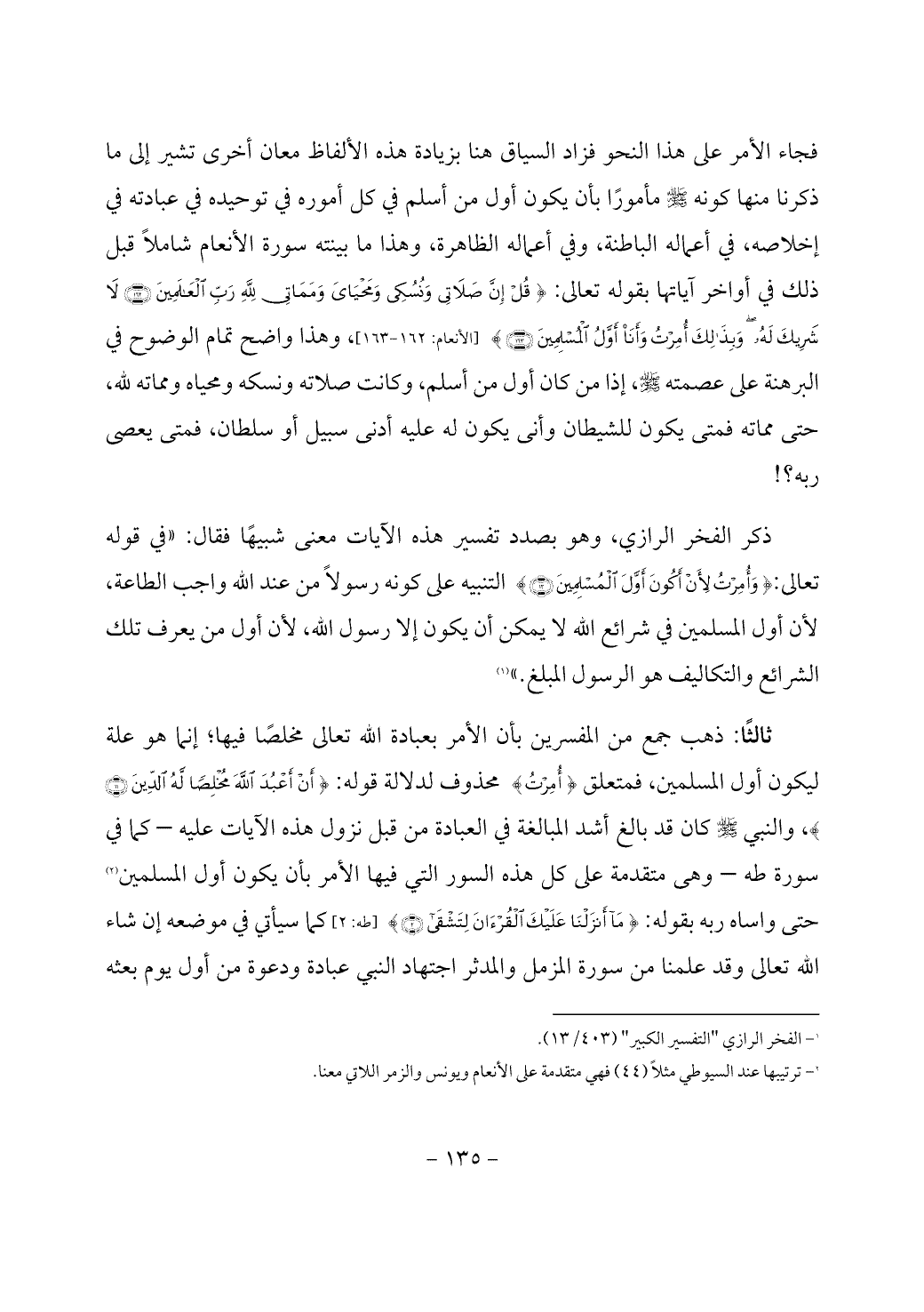 فجاء الأمر على هذا النحو فزاد السياق هنا بزيادة هذه الألفاظ معان أخرى تشير إلى ما ذكرنا منها كونه - صَلَّى اللَّهُ عَلَيْهِ وَسَلَّمَ - مأمورًا بأن يكون أول من أسلم في كل أموره في توحيده في عبادته في إخلاصه، في أعماله الباطنة، وفي أعماله الظاهرة، وهذا ما بينته سورة الأنعام شاملاً قبل ذلك في أواخر آياتها بقوله تعالى: {قُلْ إِنَّ صَلَاتِي وَنُسُكِي وَمَحْيَايَ وَمَمَاتِي لِلَّهِ رَبِّ الْعَالَمِينَ (162) لَا شَرِيكَ لَهُ وَبِذَلِكَ أُمِرْتُ وَأَنَا أَوَّلُ الْمُسْلِمِينَ (163)} [الأنعام: 162 - 163]، وهذا واضح تمام الوضوح في البرهنة على عصمته - صَلَّى اللَّهُ عَلَيْهِ وَسَلَّمَ -، إذا من كان أول من أسلم، وكانت صلاته ونسكه ومحياه ومماته لله، حتى مماته فمتى يكون للشيطان وأنى يكون له عليه أدنى سبيل أو سلطان، فمتى يعصى ربه؟!