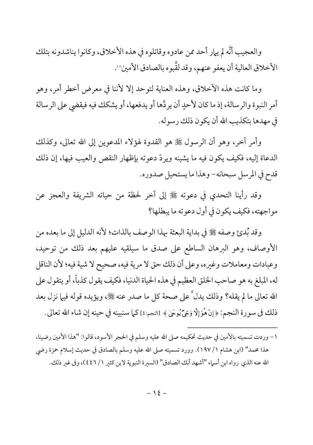 (¬1) وردت تسميته بالأمين في حديث تحكيمه صَلَّى اللَّهُ عَلَيْهِ وَسَلَّمَ في الحجر الأسود، قالوا: "هذا الأمين رضينا، هذا محمد" (ابن هشام 1/ 197). وورد تسميته صَلَّى اللَّهُ عَلَيْهِ وَسَلَّمَ بالصادق في حديث إسلام حمزة رضي الله عنه الذي رواه ابن أسماء "أشهد أنك الصادق" (السيرة النبوية لابن كثير 1/ 446)، وفي غير ذلك.