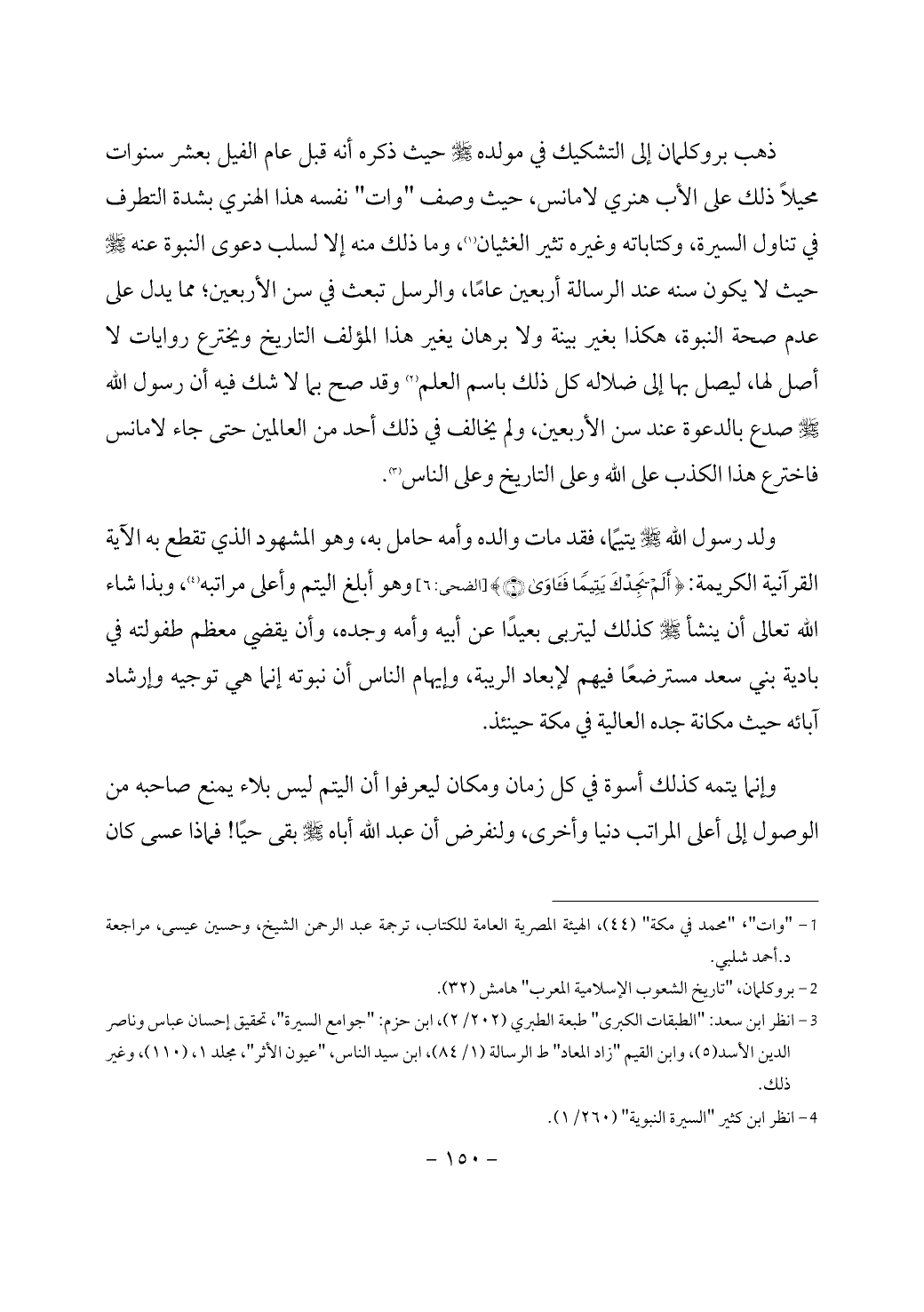 ذهب بروكلمان إلى التشكيك في مولده - صَلَّى اللَّهُ عَلَيْهِ وَسَلَّمَ - حيث ذكره أنه قبل عام الفيل بعشر سنوات محيلاً ذلك على الأب هنري لامانس، حيث وصف "وات" نفسه هذا الهنري بشدة التطرف في تناول السيرة، وكتاباته وغيره تثير الغثيان (¬1)، وما ذلك منه إلا لسلب دعوى النبوة عنه - صَلَّى اللَّهُ عَلَيْهِ وَسَلَّمَ - حيث لا يكون سنه عند الرسالة أربعين عامًا، والرسل تبعث في سن الأربعين؛ مما يدل على عدم صحة النبوة، هكذا بغير بينة ولا برهان يغير هذا المؤلف التاريخ ويخترع روايات لا أصل لها، ليصل بها إلى ضلاله كل ذلك باسم العلم (¬2) وقد صح بما لا شك فيه أن رسول الله - صَلَّى اللَّهُ عَلَيْهِ وَسَلَّمَ - صدع بالدعوة عند سن الأربعين، ولم يخالف في ذلك أحد من العالمين حتى جاء لامانس فاخترع هذا الكذب على الله وعلى التاريخ وعلى الناس (¬3).