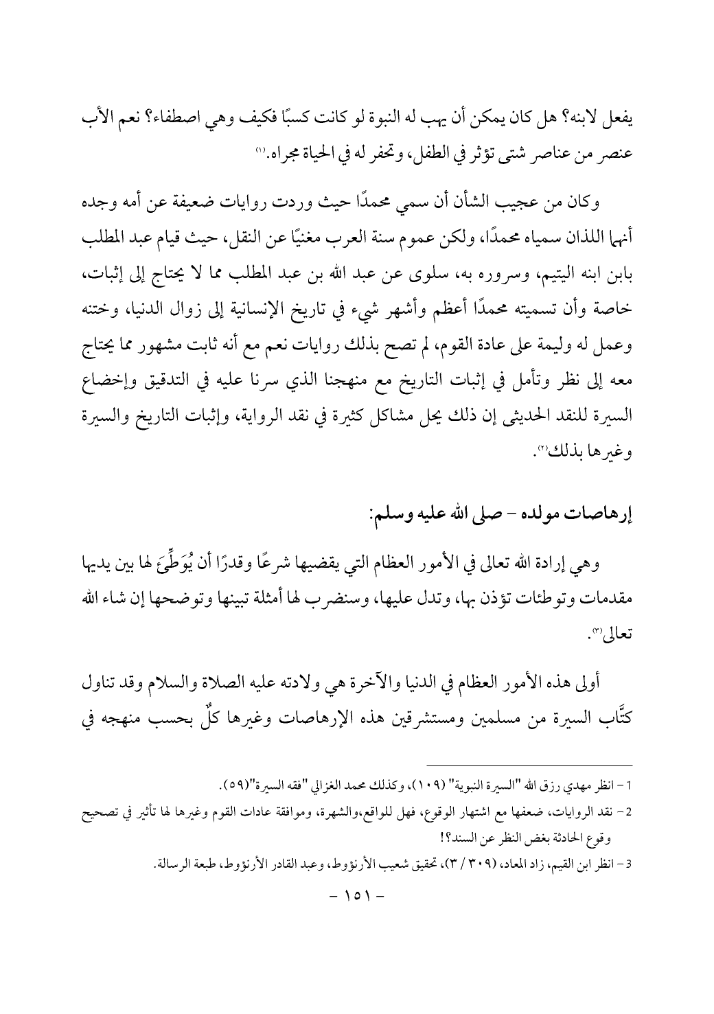 أولى هذه الأمور العظام في الدنيا والآخرة هي ولادته عليه الصلاة والسلام وقد تناول كتَّاب السيرة من مسلمين ومستشرقين هذه الإرهاصات وغيرها كلٌ بحسب منهجه في