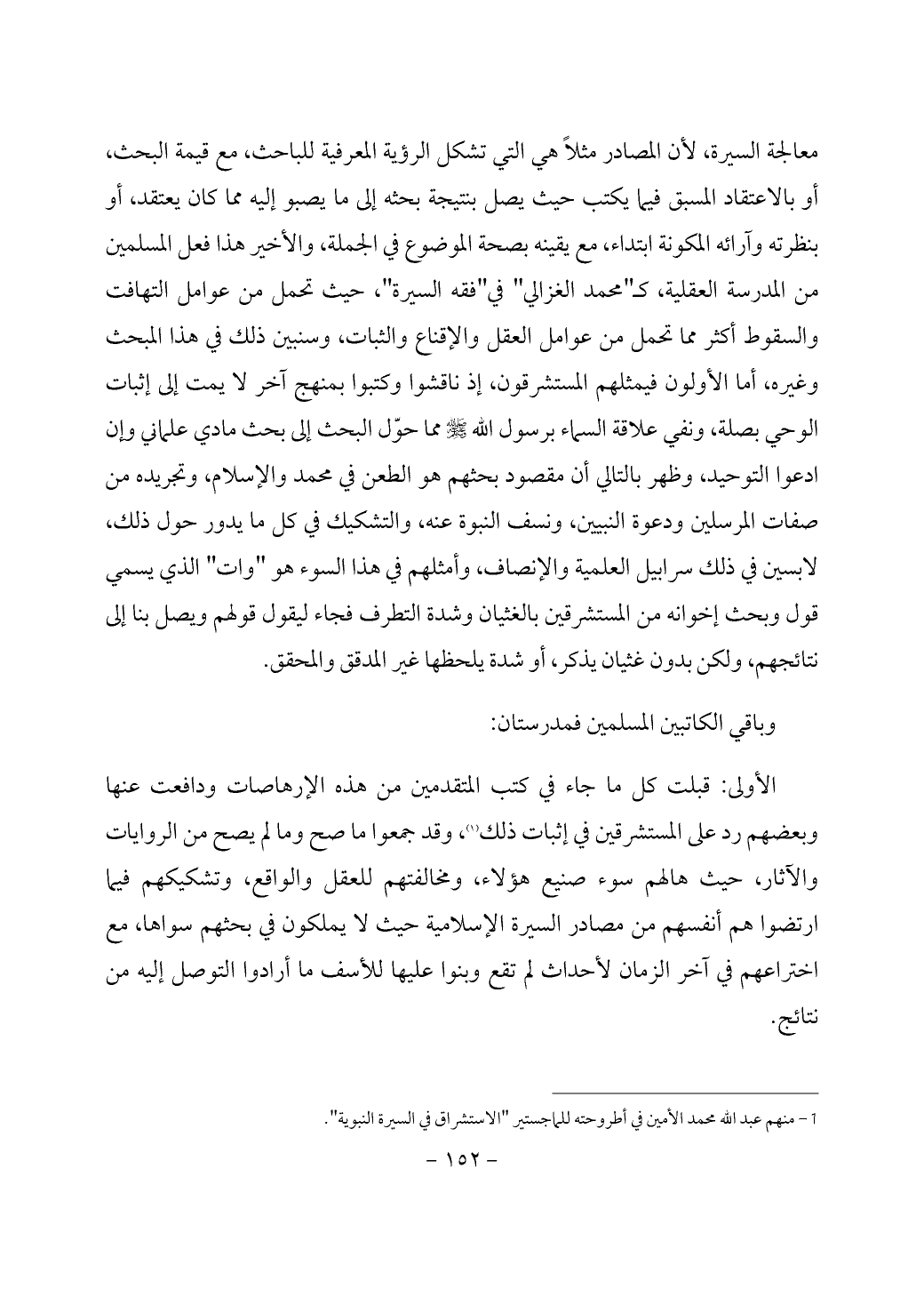 معالجة السيرة، لأن المصادر مثلاً هي التي تشكل الرؤية المعرفية للباحث، مع قيمة البحث، أو بالاعتقاد المسبق فيما يكتب حيث يصل بنتيجة بحثه إلى ما يصبو إليه مما كان يعتقد، أو بنظرته وآرائه المكونة ابتداء، مع يقينه بصحة الموضوع في الجملة، والأخير هذا فعل المسلمين من المدرسة العقلية، كـ"محمد الغزالي" في"فقه السيرة"، حيث تحمل من عوامل التهافت والسقوط أكثر مما تحمل من عوامل العقل والإقناع والثبات، وسنبين ذلك في هذا المبحث وغيره، أما الأولون فيمثلهم المستشرقون، إذ ناقشوا وكتبوا بمنهج آخر لا يمت إلى إثبات الوحي بصلة، ونفي علاقة السماء برسول الله - صَلَّى اللَّهُ عَلَيْهِ وَسَلَّمَ - مما حوّل البحث إلى بحث مادي علماني وإن ادعوا التوحيد، وظهر بالتالي أن مقصود بحثهم هو الطعن في محمد والإسلام، وتجريده من صفات المرسلين ودعوة النبيين، ونسف النبوة عنه، والتشكيك في كل ما يدور حول ذلك، لابسين في ذلك سرابيل العلمية والإنصاف، وأمثلهم في هذا السوء هو "وات" الذي يسمي قول وبحث إخوانه من المستشرقين بالغثيان وشدة التطرف فجاء ليقول قولهم ويصل بنا إلى نتائجهم، ولكن بدون غثيان يذكر، أو شدة يلحظها غير المدقق والمحقق.