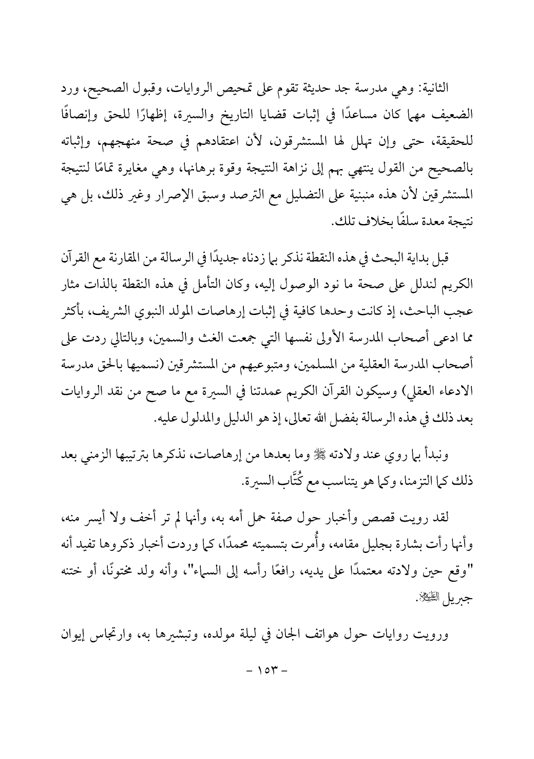 قبل بداية البحث في هذه النقطة نذكر بما زدناه جديدًا في الرسالة من المقارنة مع القرآن الكريم لندلل على صحة ما نود الوصول إليه، وكان التأمل في هذه النقطة بالذات مثار عجب الباحث، إذ كانت وحدها كافية في إثبات إرهاصات المولد النبوي الشريف، بأكثر مما ادعى أصحاب المدرسة الأولى نفسها التي جمعت الغث والسمين، وبالتالي ردت على أصحاب المدرسة العقلية من المسلمين، ومتبوعيهم من المستشرقين (نسميها بالحق مدرسة الادعاء العقلي) وسيكون القرآن الكريم عمدتنا في السيرة مع ما صح من نقد الروايات بعد ذلك في هذه الرسالة بفضل الله تعالى، إذ هو الدليل والمدلول عليه.