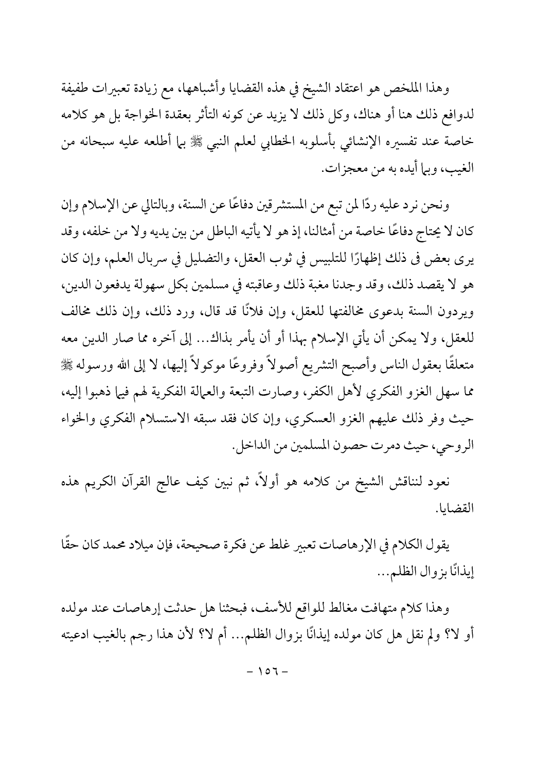 وهذا الملخص هو اعتقاد الشيخ في هذه القضايا وأشباهها، مع زيادة تعبيرات طفيفة لدوافع ذلك هنا أو هناك، وكل ذلك لا يزيد عن كونه التأثر بعقدة الخواجة بل هو كلامه خاصة عند تفسيره الإنشائي بأسلوبه الخطابي لعلم النبي - صَلَّى اللَّهُ عَلَيْهِ وَسَلَّمَ - بما أطلعه عليه سبحانه من الغيب، وبما أيده به من معجزات.