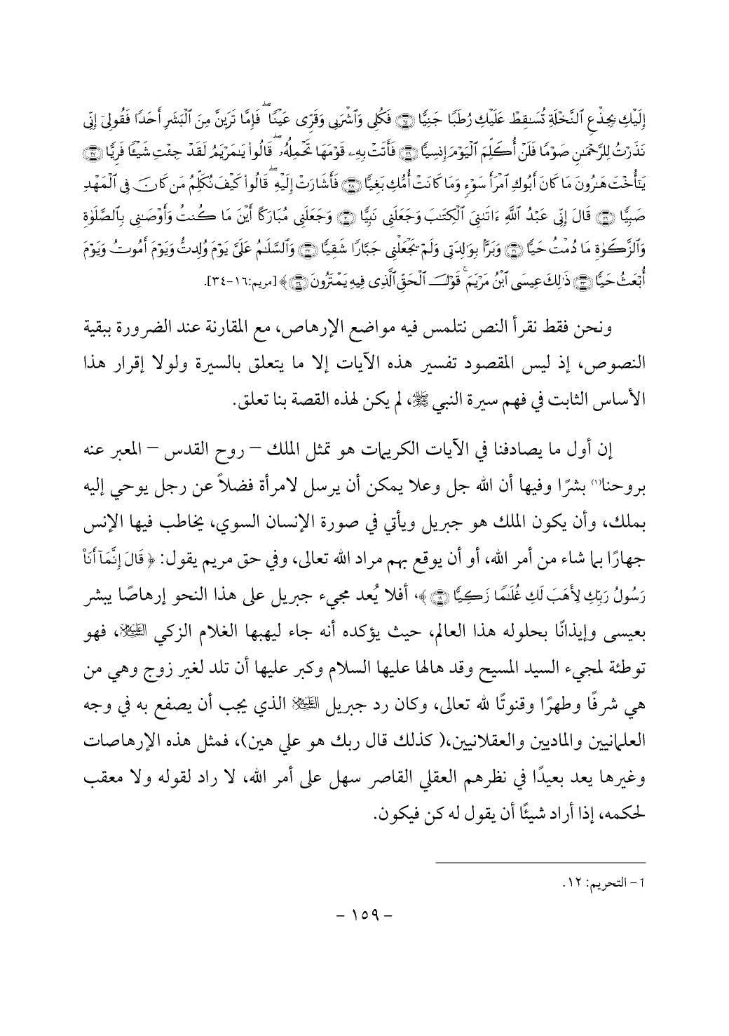 إن أول ما يصادفنا في الآيات الكريمات هو تمثل الملك - روح القدس - المعبر عنه بروحنا (¬1) بشرًا وفيها أن الله جل وعلا يمكن أن يرسل لامرأة فضلاً عن رجل يوحي إليه بملك، وأن يكون الملك هو جبريل ويأتي في صورة الإنسان السوي، يخاطب فيها الإنس جهارًا بما شاء من أمر الله، أو أن يوقع بهم مراد الله تعالى، وفي حق مريم يقول: {قَالَ إِنَّمَا أَنَا رَسُولُ رَبِّكِ لِأَهَبَ لَكِ غُلَامًا زَكِيًّا (19)}، أفلا يُعد مجيء جبريل على هذا النحو إرهاصًا يبشر بعيسى وإيذانًا بحلوله هذا العالم، حيث يؤكده أنه جاء ليهبها الغلام الزكي - عليه السلام -، فهو توطئة لمجيء السيد المسيح وقد هالها عليها السلام وكبر عليها أن تلد لغير زوج وهي من هي شرفًا وطهرًا وقنوتًا لله تعالى، وكان رد جبريل - عليه السلام - الذي يجب أن يصفع به في وجه العلمانيين والماديين والعقلانيين، (كذلك قال ربك هو علي هين)، فمثل هذه الإرهاصات وغيرها يعد بعيدًا في نظرهم العقلي القاصر سهل على أمر الله، لا راد لقوله ولا معقب لحكمه، إذا أراد شيئًا أن يقول له كن فيكون.
