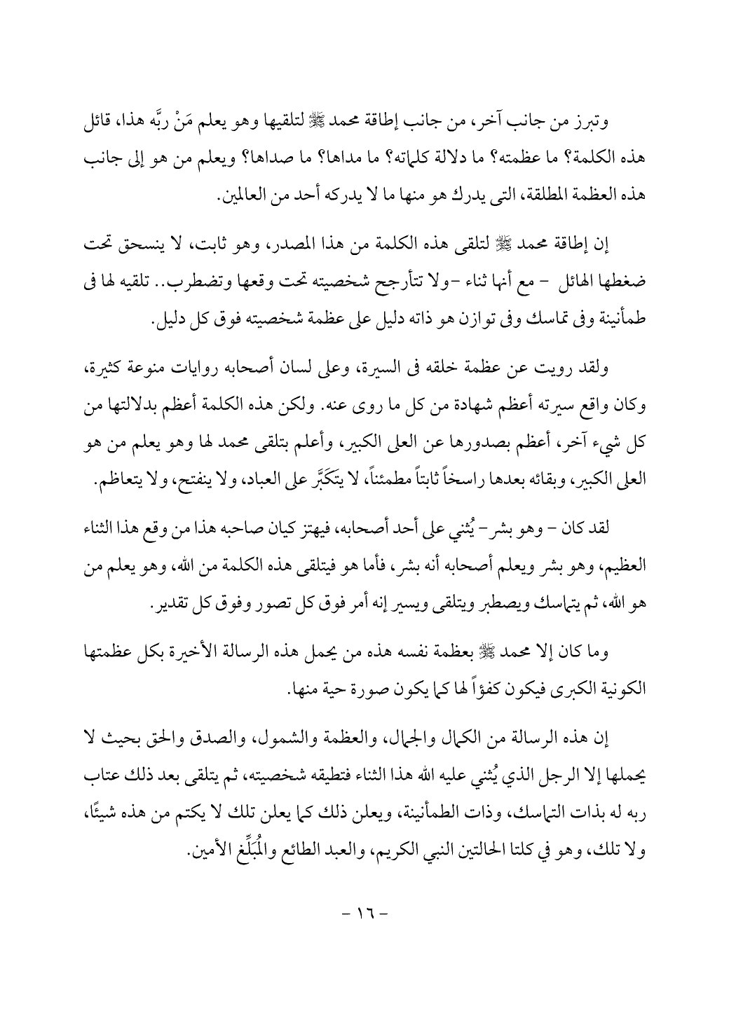 إن إطاقة محمد - صَلَّى اللَّهُ عَلَيْهِ وَسَلَّمَ - لتلقى هذه الكلمة من هذا المصدر، وهو ثابت، لا ينسحق تحت ضغطها الهائل - مع أنها ثناء - ولا تتأرجح شخصيته تحت وقعها وتضطرب .. تلقيه لها في طمأنينة وفي تماسك وفي توازن هو ذاته دليل على عظمة شخصيته فوق كل دليل.