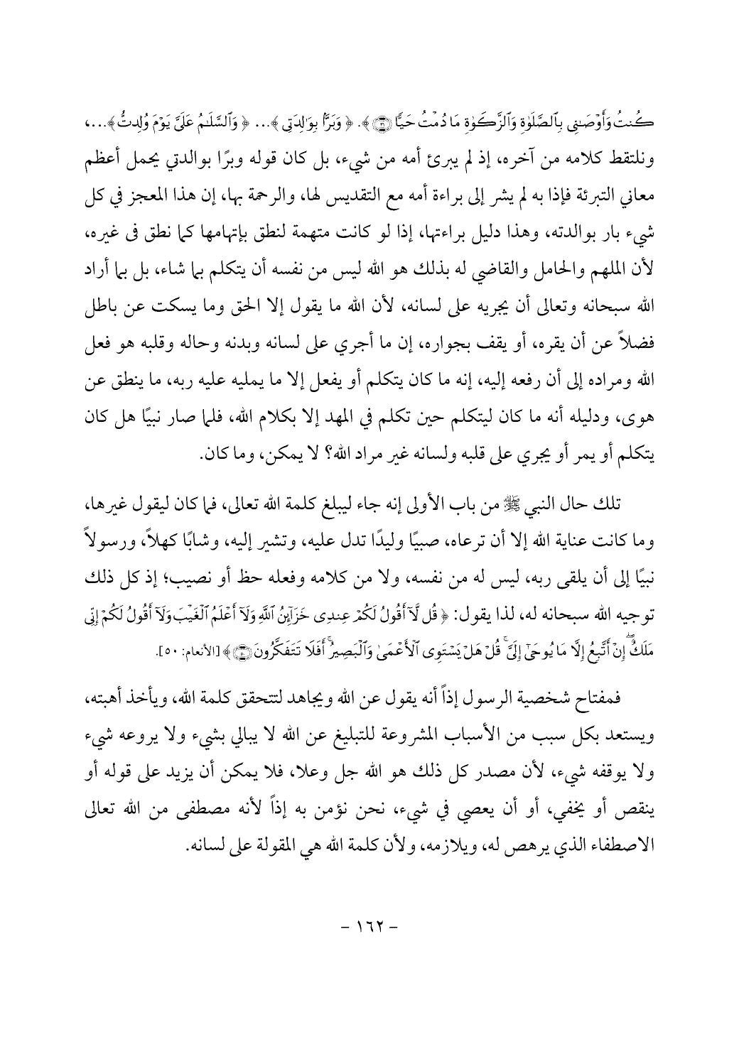 كُنْتُ وَأَوْصَانِي بِالصَّلَاةِ وَالزَّكَاةِ مَا دُمْتُ حَيًّا (31)}. {وَبَرًّا بِوَالِدَتِي} ... {وَالسَّلَامُ عَلَيَّ يَوْمَ وُلِدْتُ} ... ، ونلتقط كلامه من آخره، إذ لم يبرئ أمه من شيء، بل كان قوله وبرًا بوالدتي يحمل أعظم معاني التبرئة فإذا به لم يشر إلى براءة أمه مع التقديس لها، والرحمة بها، إن هذا المعجز في كل شيء بار بوالدته، وهذا دليل براءتها، إذا لو كانت متهمة لنطق بإتهامها كما نطق في غيره، لأن الملهم والحامل والقاضي له بذلك هو الله ليس من نفسه أن يتكلم بما شاء، بل بما أراد الله سبحانه وتعالى أن يجريه على لسانه، لأن الله ما يقول إلا الحق وما يسكت عن باطل فضلاً عن أن يقره، أو يقف بجواره، إن ما أجري على لسانه وبدنه وحاله وقلبه هو فعل الله ومراده إلى أن رفعه إليه، إنه ما كان يتكلم أو يفعل إلا ما يمليه عليه ربه، ما ينطق عن هوى، ودليله أنه ما كان ليتكلم حين تكلم في المهد إلا بكلام الله، فلما صار نبيًا هل كان يتكلم أو يمر أو يجري على قلبه ولسانه غير مراد الله؟ لا يمكن، وما كان.