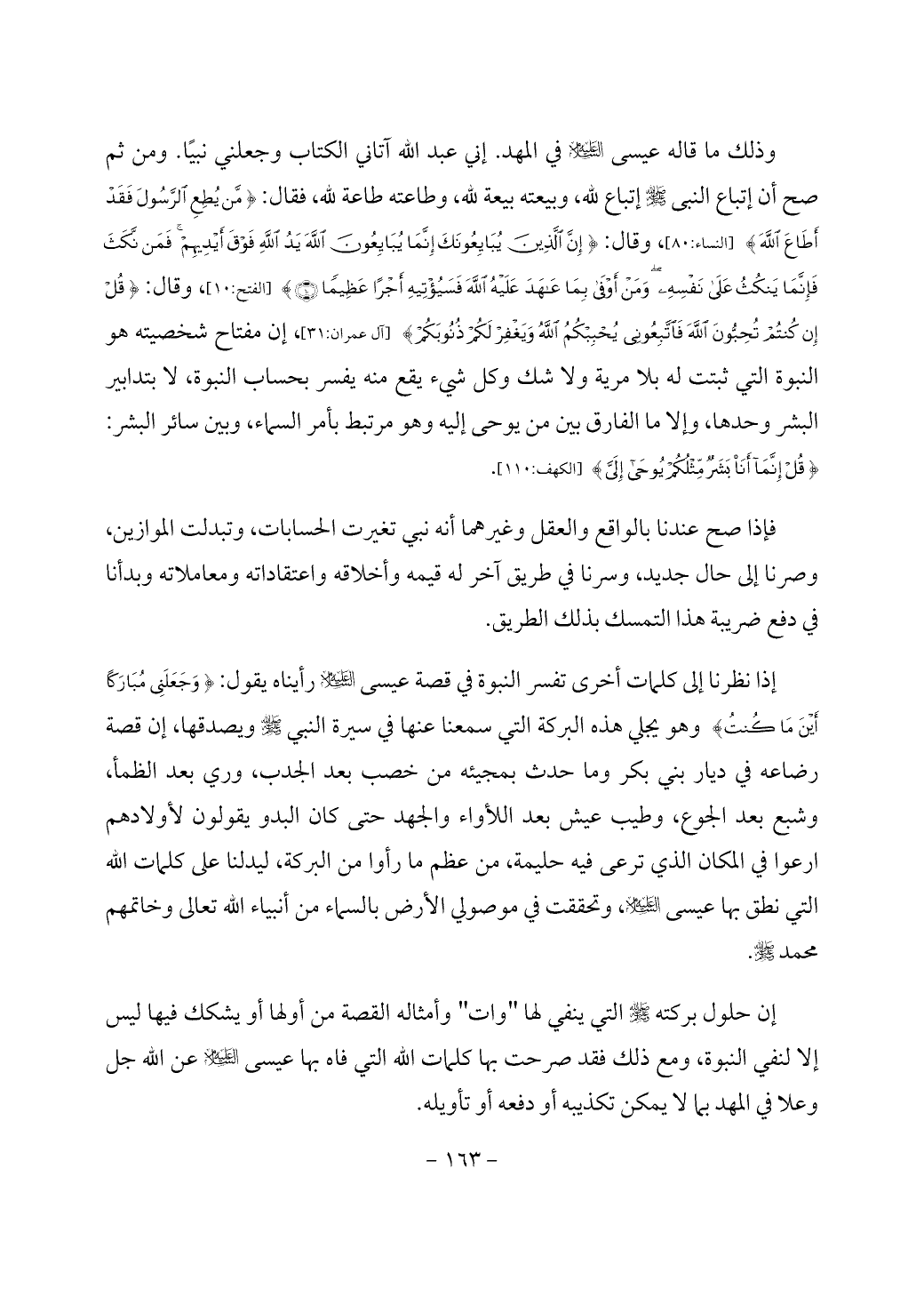 وذلك ما قاله عيسى - عليه السلام - في المهد. إني عبد الله آتاني الكتاب وجعلني نبيًا. ومن ثم صح أن إتباع النبي - صَلَّى اللَّهُ عَلَيْهِ وَسَلَّمَ - إتباع لله، وبيعته بيعة لله، وطاعته طاعة لله، فقال: {مَنْ يُطِعِ الرَّسُولَ فَقَدْ أَطَاعَ اللَّهَ} [النساء: 80]، وقال: {إِنَّ الَّذِينَ يُبَايِعُونَكَ إِنَّمَا يُبَايِعُونَ اللَّهَ يَدُ اللَّهِ فَوْقَ أَيْدِيهِمْ فَمَنْ نَكَثَ فَإِنَّمَا يَنْكُثُ عَلَى نَفْسِهِ وَمَنْ أَوْفَى بِمَا عَاهَدَ عَلَيْهُ اللَّهَ فَسَيُؤْتِيهِ أَجْرًا عَظِيمًا (10)} [الفتح: 10]، وقال: {قُلْ إِنْ كُنْتُمْ تُحِبُّونَ اللَّهَ فَاتَّبِعُونِي يُحْبِبْكُمُ اللَّهُ وَيَغْفِرْ لَكُمْ ذُنُوبَكُمْ} [آل عمران: 31]، إن مفتاح شخصيته هو النبوة التي ثبتت له بلا مرية ولا شك وكل شيء يقع منه يفسر بحساب النبوة، لا بتدابير البشر وحدها، وإلا ما الفارق بين من يوحى إليه وهو مرتبط بأمر السماء، وبين سائر البشر: {قُلْ إِنَّمَا أَنَا بَشَرٌ مِثْلُكُمْ يُوحَى إِلَيَّ} [الكهف: 110].