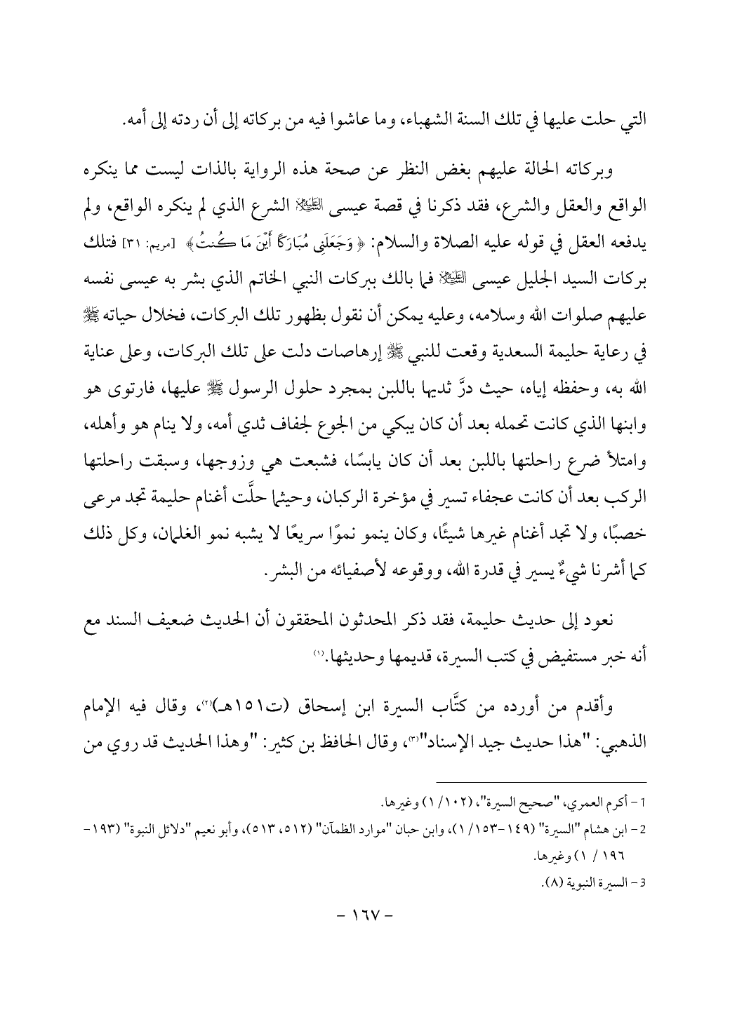 نعود إلى حديث حليمة، فقد ذكر المحدثون المحققون أن الحديث ضعيف السند مع أنه خبر مستفيض في كتب السيرة، قديمها وحديثها. (¬1)