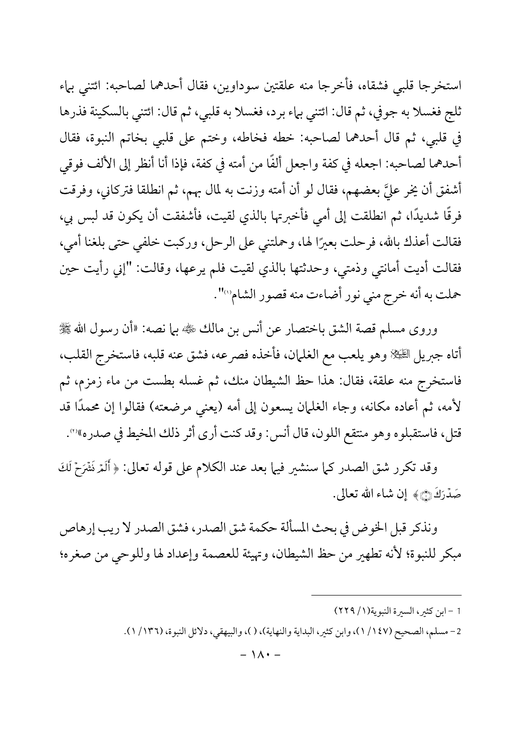 ونذكر قبل الخوض في بحث المسألة حكمة شق الصدر، فشق الصدر لا ريب إرهاص مبكر للنبوة؛ لأنه تطهير من حظ الشيطان، وتهيئة للعصمة وإعداد لها وللوحي من صغره؛