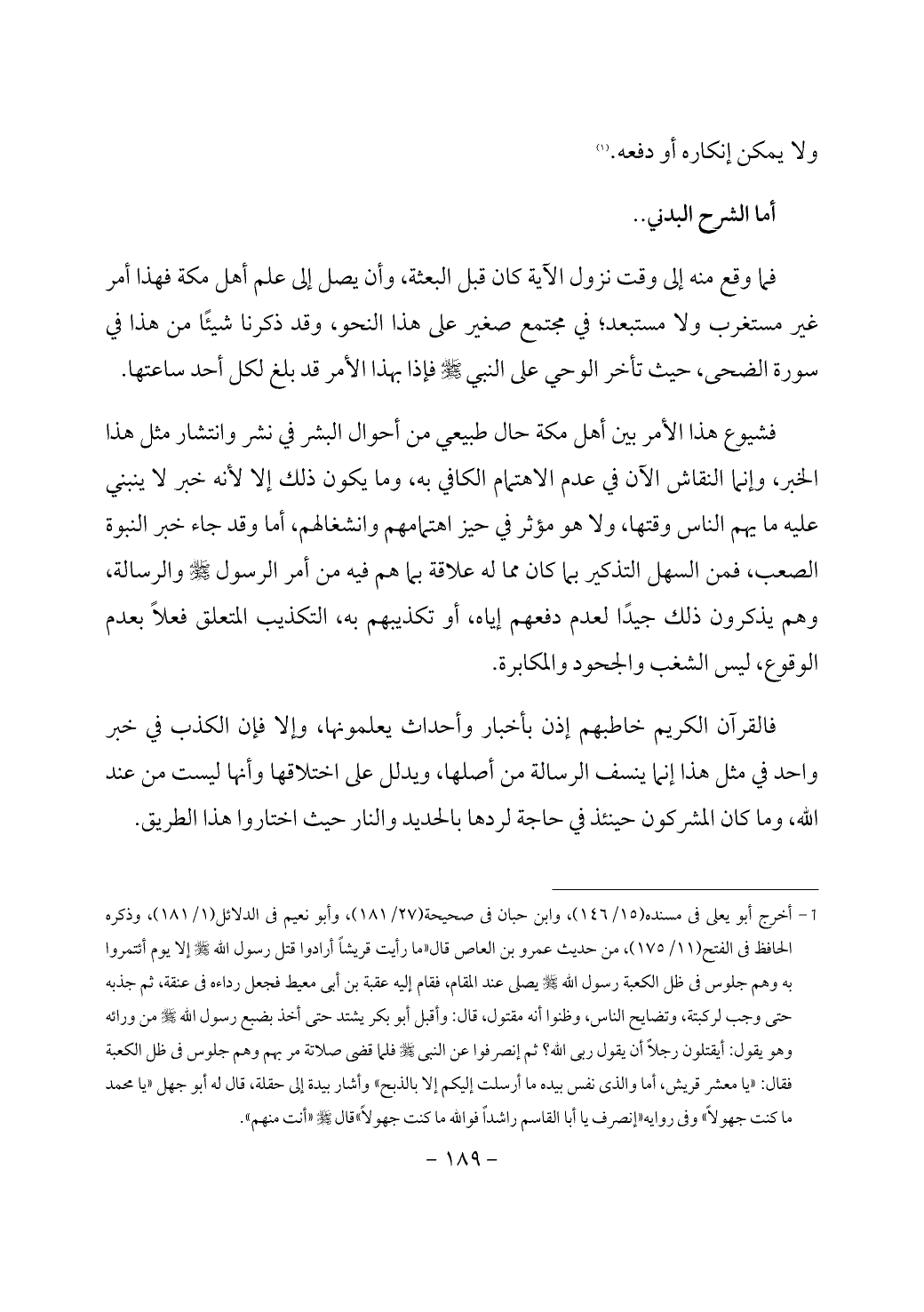 (¬1) أخرج أبو يعلى في مسنده (15/ 146)، وابن حبان في صحيحة (27/ 181)، وأبو نعيم في الدلائل (1/ 181)، وذكره الحافظ في الفتح (11/ 175)، من حديث عمرو بن العاص قال «ما رأيت قريشاً أرادوا قتل رسول الله - صَلَّى اللَّهُ عَلَيْهِ وَسَلَّمَ - إلا يوم أئتمروا به وهم جلوس في ظل الكعبة رسول الله - صَلَّى اللَّهُ عَلَيْهِ وَسَلَّمَ - يصلى عند المقام، فقام إليه عقبة بن أبى معيط فجعل رداءه في عنقة، ثم جذبه حتى وجب لركبتة، وتضايح الناس، وظنوا أنه مقتول، قال: وأقبل أبو بكر يشتد حتى أخذ بضبع رسول الله - صَلَّى اللَّهُ عَلَيْهِ وَسَلَّمَ - من ورائه وهو يقول: أيقتلون رجلاً أن يقول ربى الله؟ ثم إنصرفوا عن النبي - صَلَّى اللَّهُ عَلَيْهِ وَسَلَّمَ - فلما قضى صلاتة مر بهم وهم جلوس في ظل الكعبة فقال: «يا معشر قريش، أما والذى نفس بيده ما أرسلت إليكم إلا بالذبح» وأشار بيدة إلى حقلة، قال له أبو جهل «يا محمد ما كنت جهولاً» وفي روايه «إنصرف يا أبا القاسم راشداً فوالله ما كنت جهولاً» قال - صَلَّى اللَّهُ عَلَيْهِ وَسَلَّمَ - «أنت منهم».