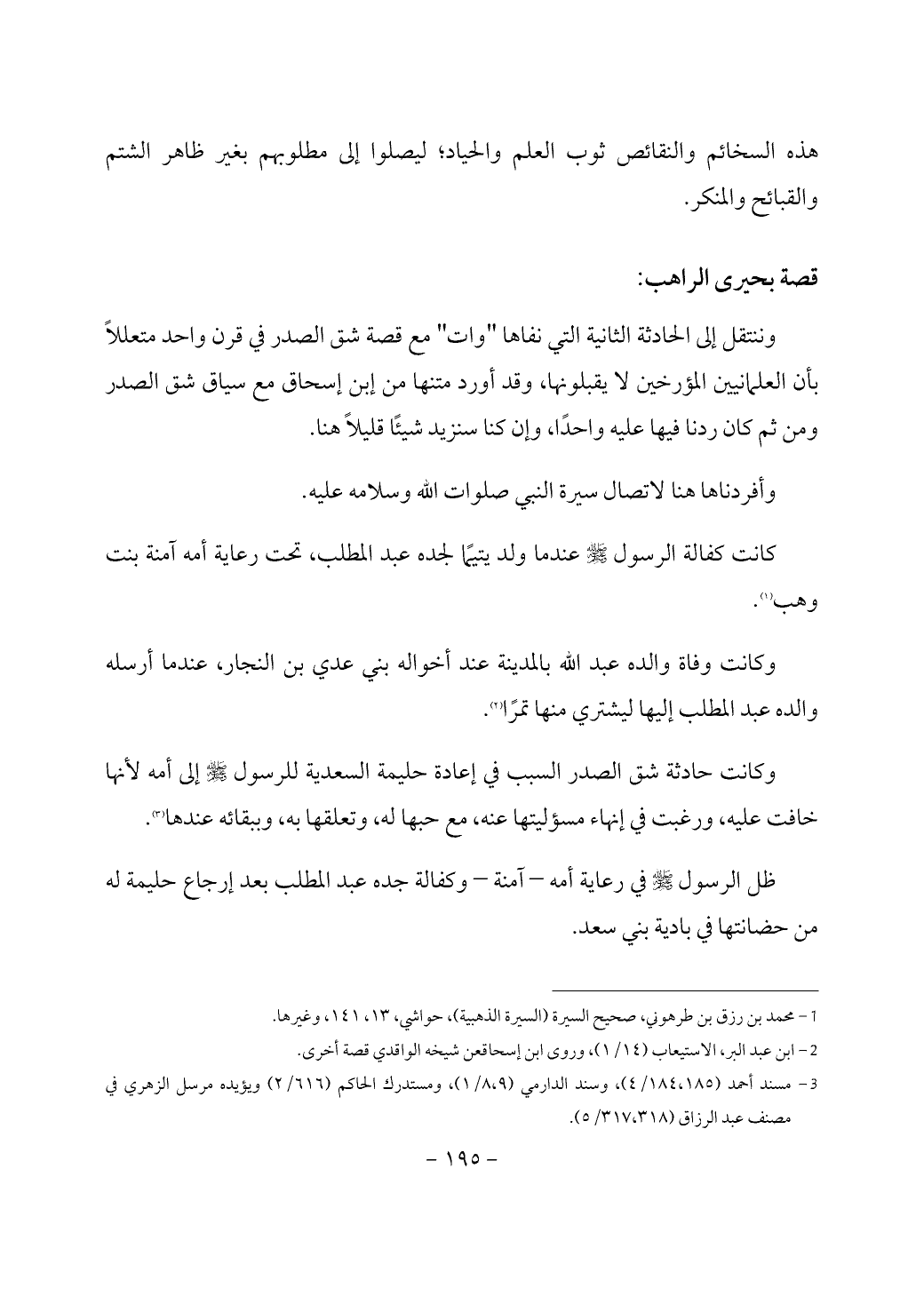 وننتقل إلى الحادثة الثانية التي نفاها "وات" مع قصة شق الصدر في قرن واحد متعللاً بأن العلمانيين المؤرخين لا يقبلونها، وقد أورد متنها من إبن إسحاق مع سياق شق الصدر ومن ثم كان ردنا فيها عليه واحدًا، وإن كنا سنزيد شيئًا قليلاً هنا.