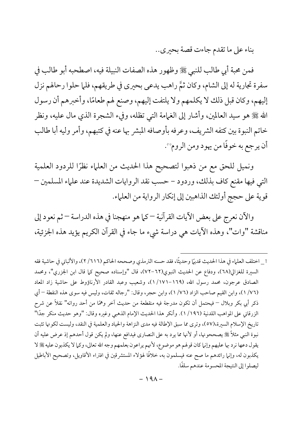 (¬1) _ اختلف العلماء في هذا الحديث قديمًا وحديثًا، فقد حسنه الترمذي وصححه الحاكم (616/ 2)، والألباني في حاشية فقه السيرة للغزالي (68)، ودفاع عن الحديث النبوي (62 - 72)، قال "وإسناده صحيح كما قال ابن الجزري"، ومحمد الصادق عرجون، محمد رسول الله، (169 - 171/ 1)، وشعيب وعبد القادر الأرناؤوط على حاشية زاد المعاد (76/ 1)، وابن القيم صاحب الزاد (76/ 1)، وابن حجر، وقال: "رجاله ثقات، وليس فيه سوى هذه النقطة – أي ذكر أبي بكر وبلال – فيحتمل أن تكون مدرجة فيه منقطعة من حديث آخر وهمًا من أحد رواته" نقلاً عن شرح الزرقاني على المواهب اللدنية (196/ 1). وأنكر هذا الحديث الإمام الذهبي وغيره وقال: "وهو حديث منكر جدًا" تاريخ الإسلام السيرة، (57)، وترى مما سبق الإطالة فيه مدى النزاهة والحياد والعلمية في النقد، وليست لكونها تثبت نبوة النبي مثلاً - صَلَّى اللَّهُ عَلَيْهِ وَسَلَّمَ - يصححونها، أو لأنها مما يرد به على النصارى فيدافع عنها، ولم يكن قول أحدهم إذ عرض عليه أن يقول دعها نرد بها عليهم وإنما كان قولهم هو موضوع، لأنهم يراعون بعلمهم وجه الله تعالى، وكما لا يكذبون عليه - صَلَّى اللَّهُ عَلَيْهِ وَسَلَّمَ - لا يكذبون له، وإنما رائدهم ما صح عنه فيسلمون به، خلافًا لهؤلاء المستشرقين في افتراء الأقاويل، وتصحيح الأباطيل ليصلوا إلى النتيجة المحسومة عندهم سلفًا.