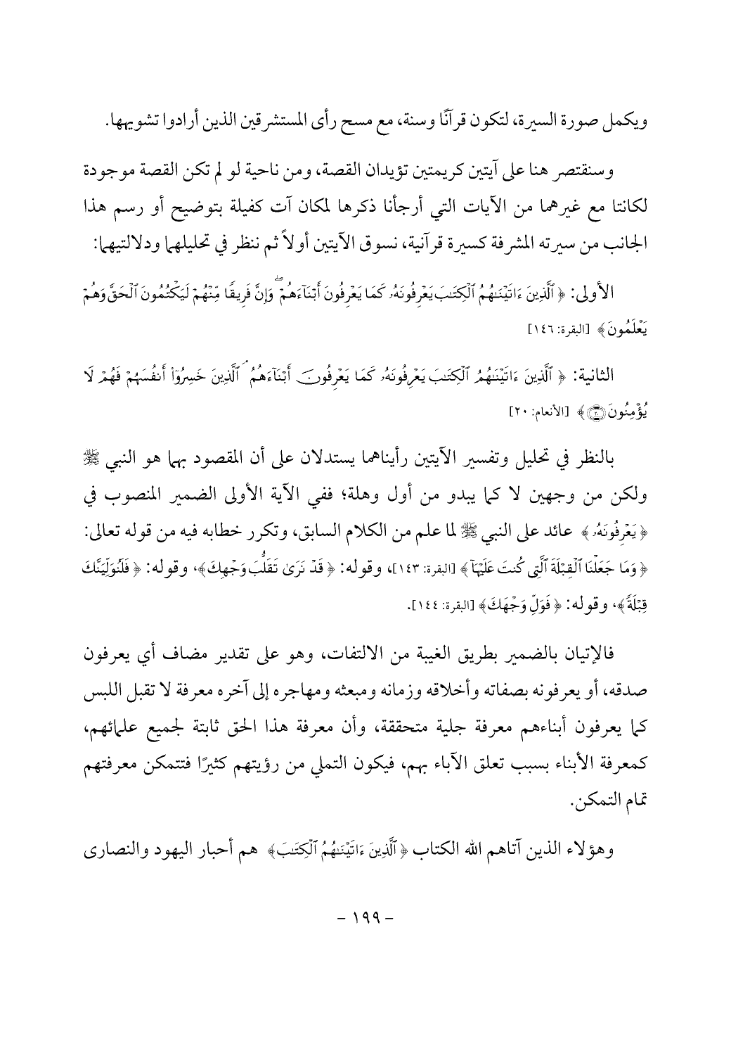 {يَعْرِفُونَهُ} عائد على النبي - صَلَّى اللَّهُ عَلَيْهِ وَسَلَّمَ - لما علم من الكلام السابق، وتكرر خطابه فيه من قوله تعالى: {وَمَا جَعَلْنَا الْقِبْلَةَ الَّتِي كُنْتَ عَلَيْهَا} [البقرة: 143]، وقوله: {قَدْ نَرَى تَقَلُّبَ وَجْهِكَ}، وقوله: {فَلَنُوَلِّيَنَّكَ قِبْلَةً}، وقوله: {فَوَلِّ وَجْهَكَ} [البقرة: 144].