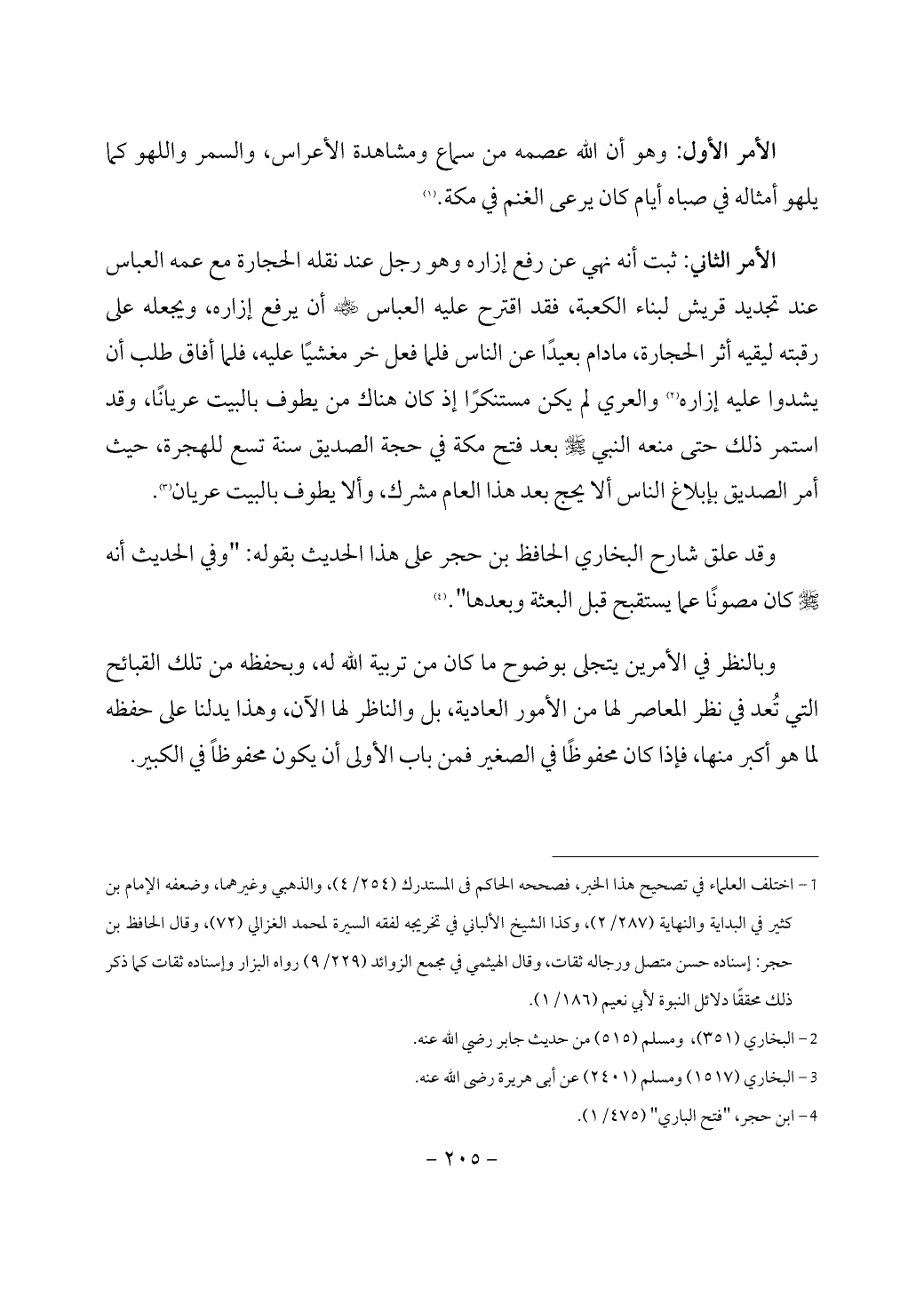 الأمر الأول: وهو أن الله عصمه من سماع ومشاهدة الأعراس، والسمر واللهو كما يلهو أمثاله في صباه أيام كان يرعى الغنم في مكة. (¬1)