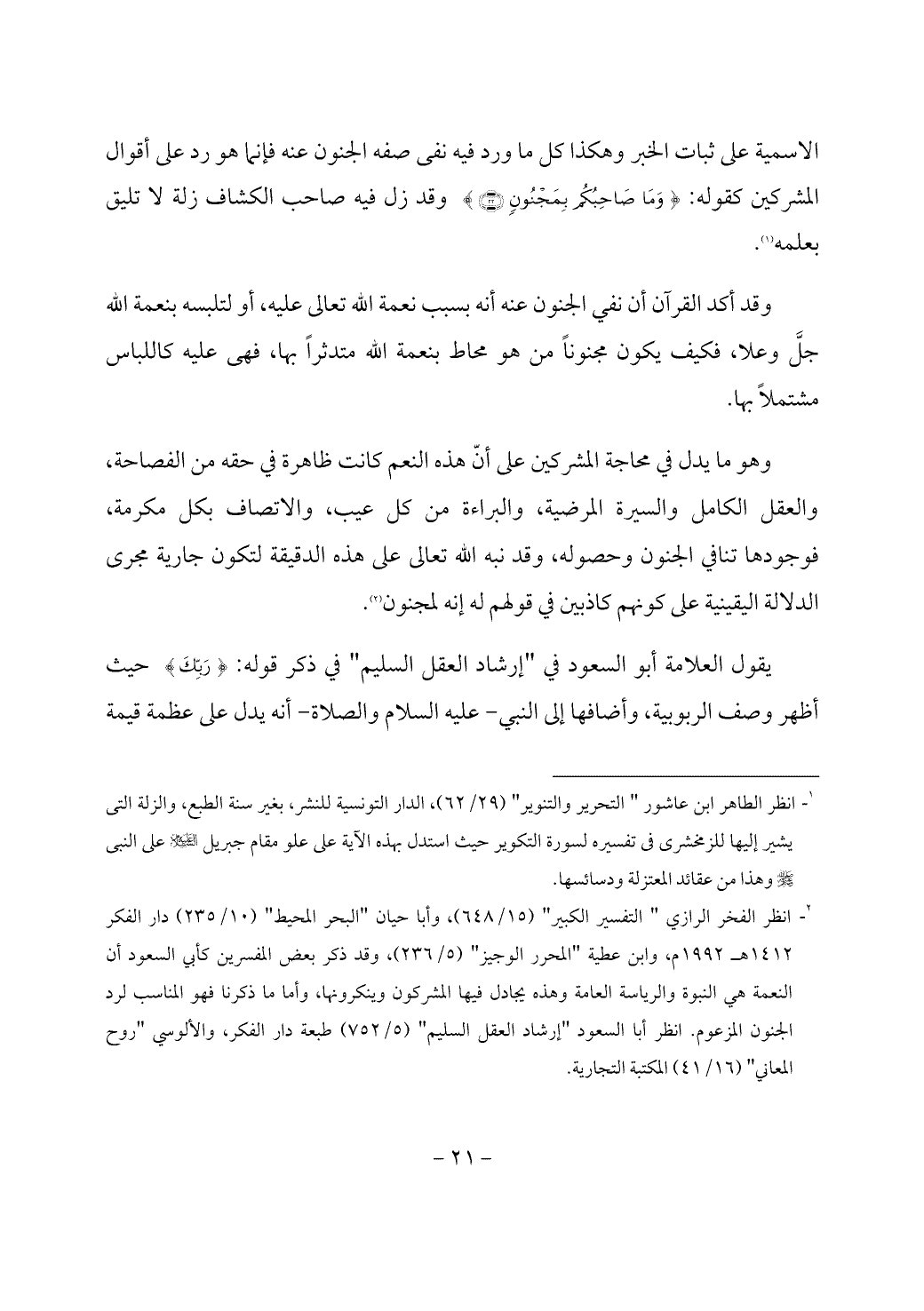 (¬2) انظر الفخر الرازي " التفسير الكبير" (15/ 648)، وأبا حيان "البحر المحيط" (10/ 235) دار الفكر 1412 هـ 1992 م، وابن عطية "المحرر الوجيز" (5/ 236)، وقد ذكر بعض المفسرين كأبي السعود أن النعمة هي النبوة والرياسة العامة وهذه يجادل فيها المشركون وينكرونها، وأما ما ذكرنا فهو المناسب لرد الجنون المزعوم. انظر أبا السعود "إرشاد العقل السليم" (5/ 752) طبعة دار الفكر، والألوسي "روح المعاني" (16/ 41) المكتبة التجارية.