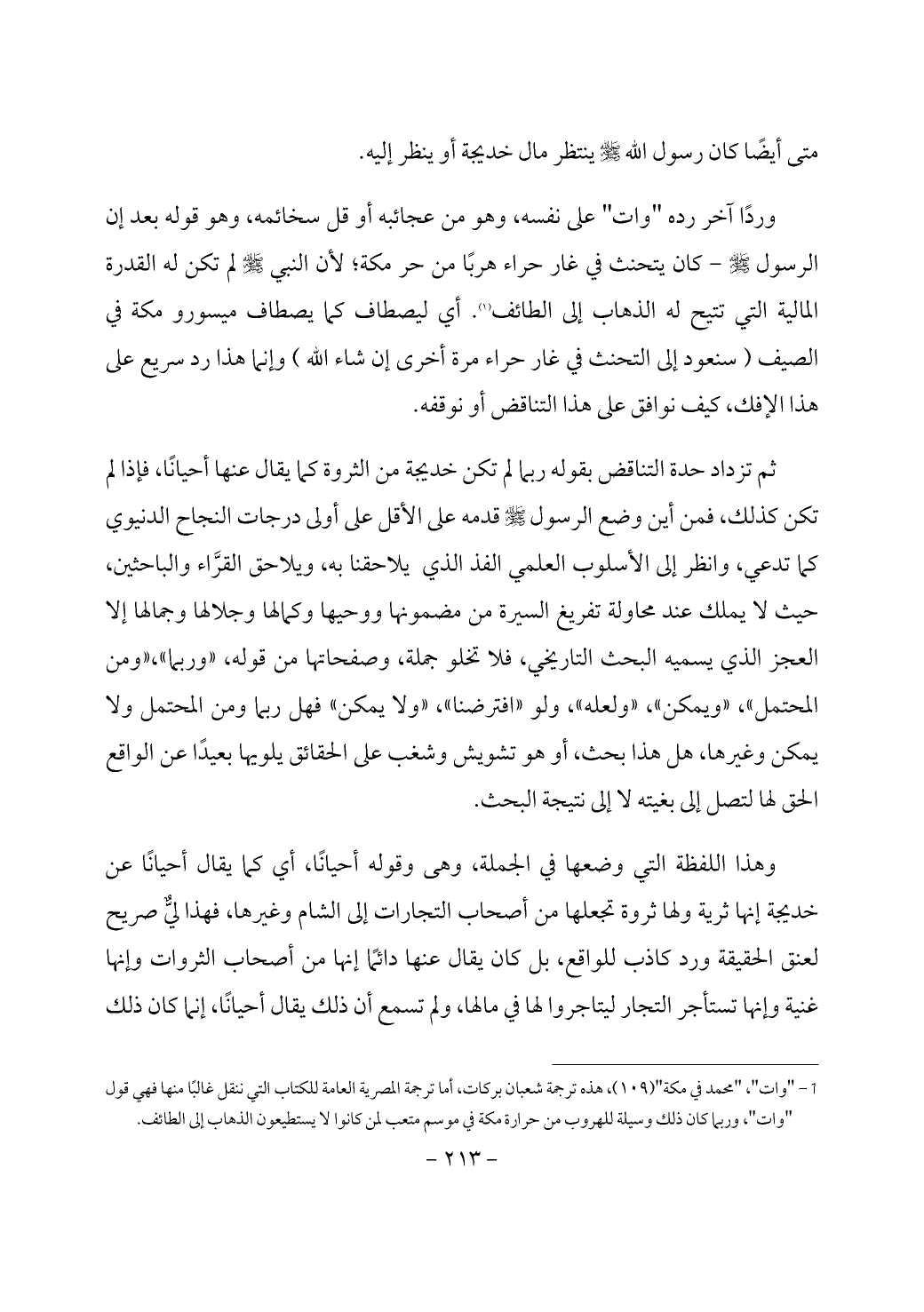 (¬1) "وات"، "محمد في مكة" (109)، هذه ترجمة شعبان بركات، أما ترجمة المصرية العامة للكتاب التي ننقل غالبًا منها فهي قول "وات"، وربما كان ذلك وسيلة للهروب من حرارة مكة في موسم متعب لمن كانوا لا يستطيعون الذهاب إلى الطائف.