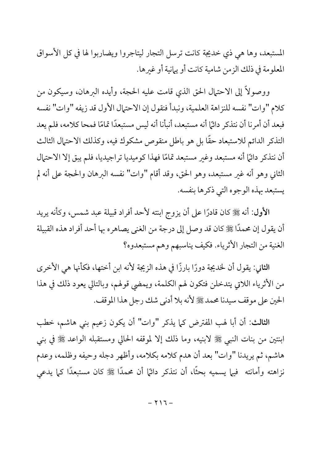 الأول: أنه - صَلَّى اللَّهُ عَلَيْهِ وَسَلَّمَ - كان قادرًا على أن يزوج ابنته لأحد أفراد قبيلة عبد شمس، وكأنه يريد أن يقول إن محمدًا - صَلَّى اللَّهُ عَلَيْهِ وَسَلَّمَ - كان قد وصل إلى درجة من الغنى يصاهره بها أحد أفراد هذه القبيلة الغنية من التجار الأثرياء. فكيف يناسبهم وهم مستبعدوه؟