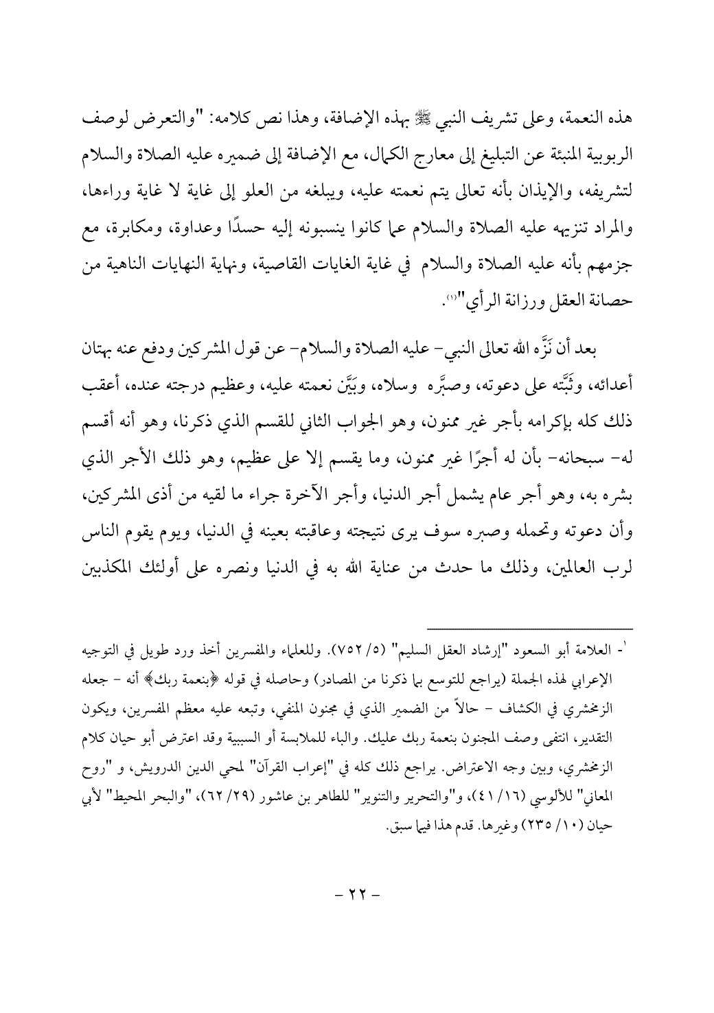 (¬1) العلامة أبو السعود "إرشاد العقل السليم" (5/ 752). وللعلماء والمفسرين أخذ ورد طويل في التوجيه الإعرابي لهذه الجملة (يراجع للتوسع بما ذكرنا من المصادر) وحاصله في قوله {بنعمة ربك} أنه - جعله الزمخشري في الكشاف - حالاً من الضمير الذي في مجنون المنفي، وتبعه عليه معظم المفسرين، ويكون التقدير، انتفى وصف المجنون بنعمة ربك عليك. والباء للملابسة أو السببية وقد اعترض أبو حيان كلام الزمخشري، وبين وجه الاعتراض. يراجع ذلك كله في "إعراب القرآن" لمحي الدين الدرويش، و "روح المعاني" للألوسي (16/ 41)، و"والتحرير والتنوير" للطاهر بن عاشور (29/ 62)، "والبحر المحيط" لأبي حيان (10/ 235) وغيرها. قدم هذا فيما سبق.