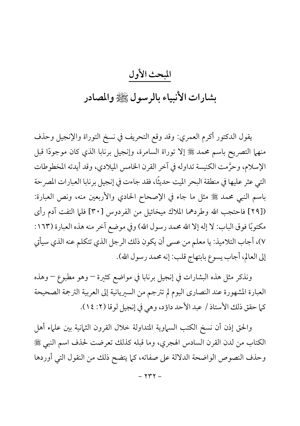 يقول الدكتور أكرم العمري: وقد وقع التحريف في نسخ التوراة والإنجيل وحذف منهما التصريح باسم محمد - صَلَّى اللَّهُ عَلَيْهِ وَسَلَّمَ - إلا توراة السامرة، وإنجيل برنابا الذي كان موجودًا قبل الإسلام، وحرَّمت الكنيسة تداوله في آخر القرن الخامس الميلادي، وقد أيدته المخطوطات التي عثر عليها في منطقة البحر الميت حديثًا، فقد جاءت في إنجيل برنابا العبارات المصرحة باسم النبي محمد - صَلَّى اللَّهُ عَلَيْهِ وَسَلَّمَ - مثل ما جاء في الإصحاح الحادي والأربعين منه، ونص العبارة: ([29] فاحتجب الله وطردهما الملاك ميخائيل من الفردوس [30] فلما التفت آدم رأى مكتوبًا فوق الباب: لا إله إلا الله محمد رسول الله) وفي موضع آخر منه هذه العبارة (163: 7)، أجاب التلاميذ: يا معلم من عسى أن يكون ذلك الرجل الذي تتكلم عنه الذي سيأتي إلى العالم، أجاب يسوع بابتهاج قلب: إنه محمد رسول الله).
