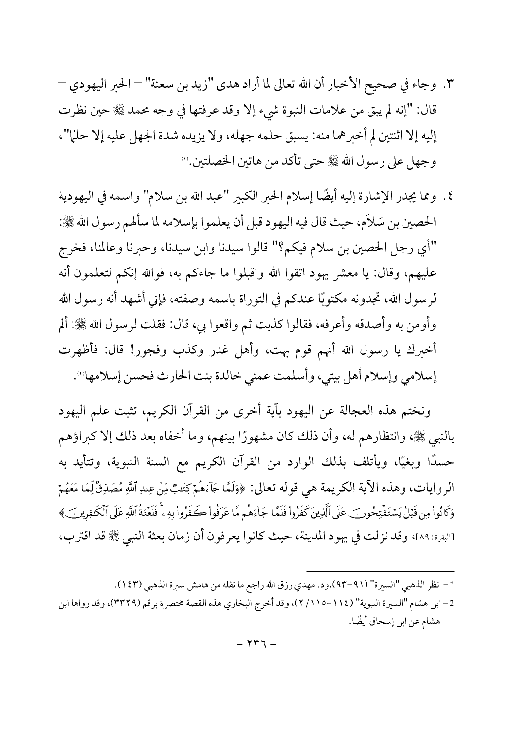 4 - ومما يجدر الإشارة إليه أيضًا إسلام الحبر الكبير "عبد الله بن سلام" واسمه في اليهودية الحصين بن سَلاَم، حيث قال فيه اليهود قبل أن يعلموا بإسلامه لما سألهم رسول الله - صَلَّى اللَّهُ عَلَيْهِ وَسَلَّمَ -: "أي رجل الحصين بن سلام فيكم؟ " قالوا سيدنا وابن سيدنا، وحبرنا وعالمنا، فخرج عليهم، وقال: يا معشر يهود اتقوا الله واقبلوا ما جاءكم به، فوالله إنكم لتعلمون أنه لرسول الله، تجدونه مكتوبًا عندكم في التوراة باسمه وصفته، فإني أشهد أنه رسول الله وأومن به وأصدقه وأعرفه، فقالوا كذبت ثم واقعوا بي، قال: فقلت لرسول الله - صَلَّى اللَّهُ عَلَيْهِ وَسَلَّمَ -: ألم أخبرك يا رسول الله أنهم قوم بهت، وأهل غدر وكذب وفجور! قال: فأظهرت إسلامي وإسلام أهل بيتي، وأسلمت عمتي خالدة بنت الحارث فحسن إسلامها (¬2).