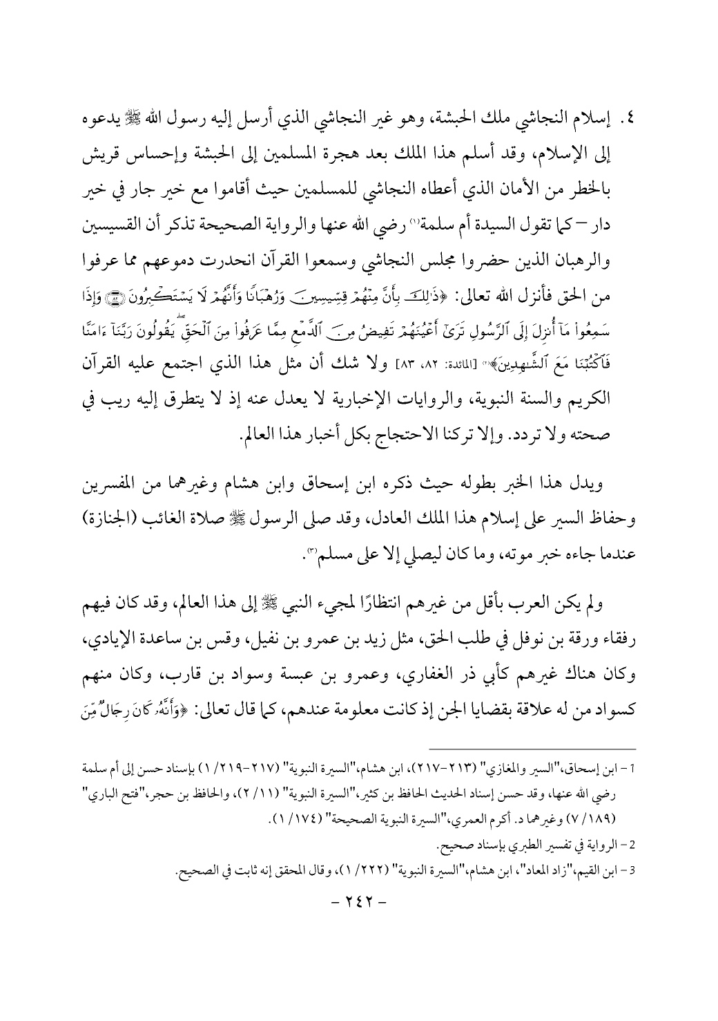 4 - إسلام النجاشي ملك الحبشة، وهو غير النجاشي الذي أرسل إليه رسول الله - صَلَّى اللَّهُ عَلَيْهِ وَسَلَّمَ - يدعوه إلى الإسلام، وقد أسلم هذا الملك بعد هجرة المسلمين إلى الحبشة وإحساس قريش بالخطر من الأمان الذي أعطاه النجاشي للمسلمين حيث أقاموا مع خير جار في خير دار - كما تقول السيدة أم سلمة (¬1) رضي الله عنها والرواية الصحيحة تذكر أن القسيسين والرهبان الذين حضروا مجلس النجاشي وسمعوا القرآن انحدرت دموعهم مما عرفوا من الحق فأنزل الله تعالى: {بِأَنَّ مِنْهُمْ قِسِّيسِينَ وَرُهْبَانًا وَأَنَّهُمْ لَا يَسْتَكْبِرُونَ (82) وَإِذَا سَمِعُوا مَا أُنْزِلَ إِلَى الرَّسُولِ تَرَى أَعْيُنَهُمْ تَفِيضُ مِنَ الدَّمْعِ مِمَّا عَرَفُوا مِنَ الْحَقِّ يَقُولُونَ رَبَّنَا آمَنَّا فَاكْتُبْنَا مَعَ الشَّاهِدِينَ} (¬2) [المائدة: 82، 83] ولا شك أن مثل هذا الذي اجتمع عليه القرآن الكريم والسنة النبوية، والروايات الإخبارية لا يعدل عنه إذ لا يتطرق إليه ريب في صحته ولا تردد. وإلا تركنا الاحتجاج بكل أخبار هذا العالم.
