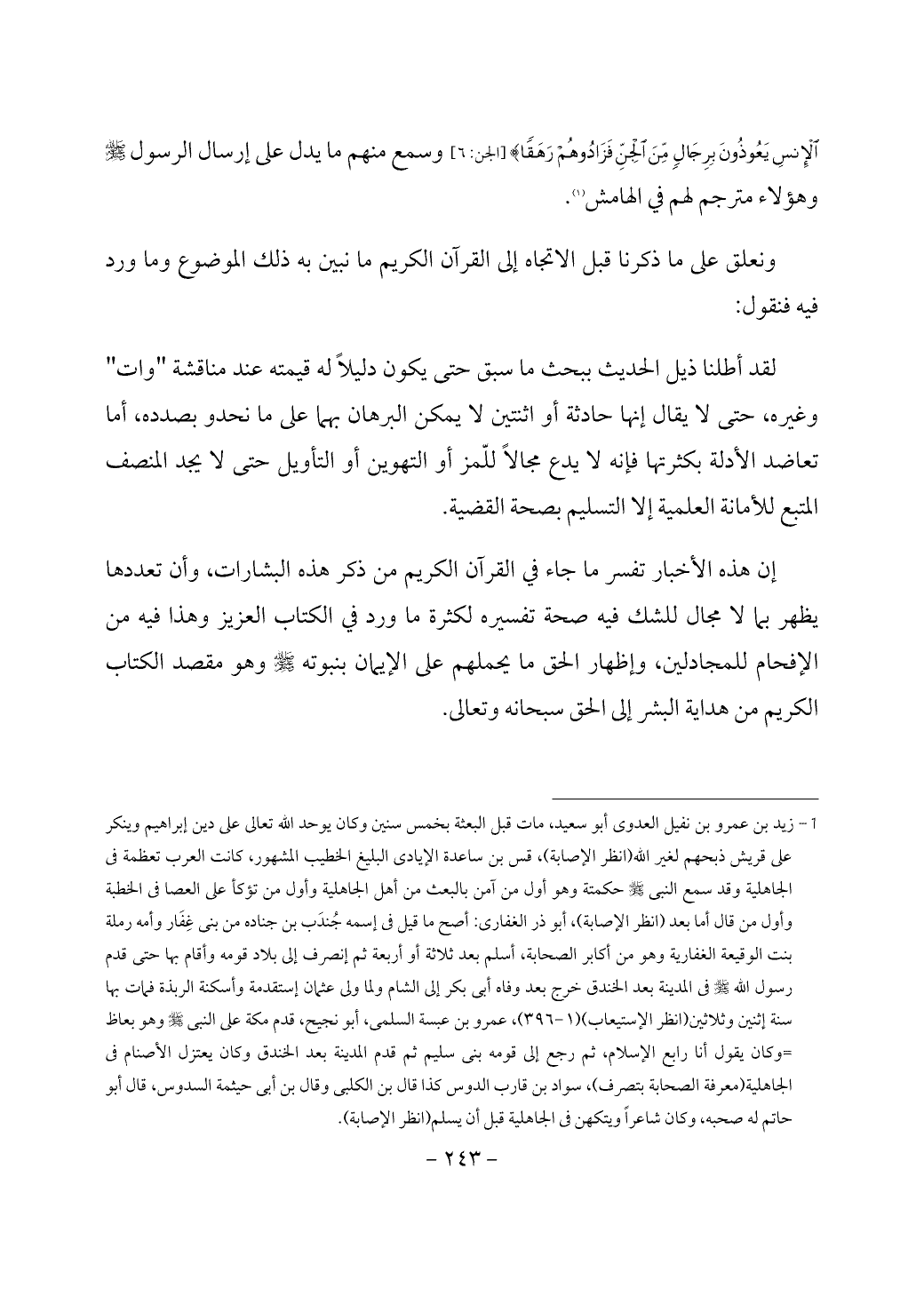 الْإِنْسِ يَعُوذُونَ بِرِجَالٍ مِنَ الْجِنِّ فَزَادُوهُمْ رَهَقًا} [الجن: 6] وسمع منهم ما يدل على إرسال الرسول - صَلَّى اللَّهُ عَلَيْهِ وَسَلَّمَ - وهؤلاء مترجم لهم في الهامش (¬1).